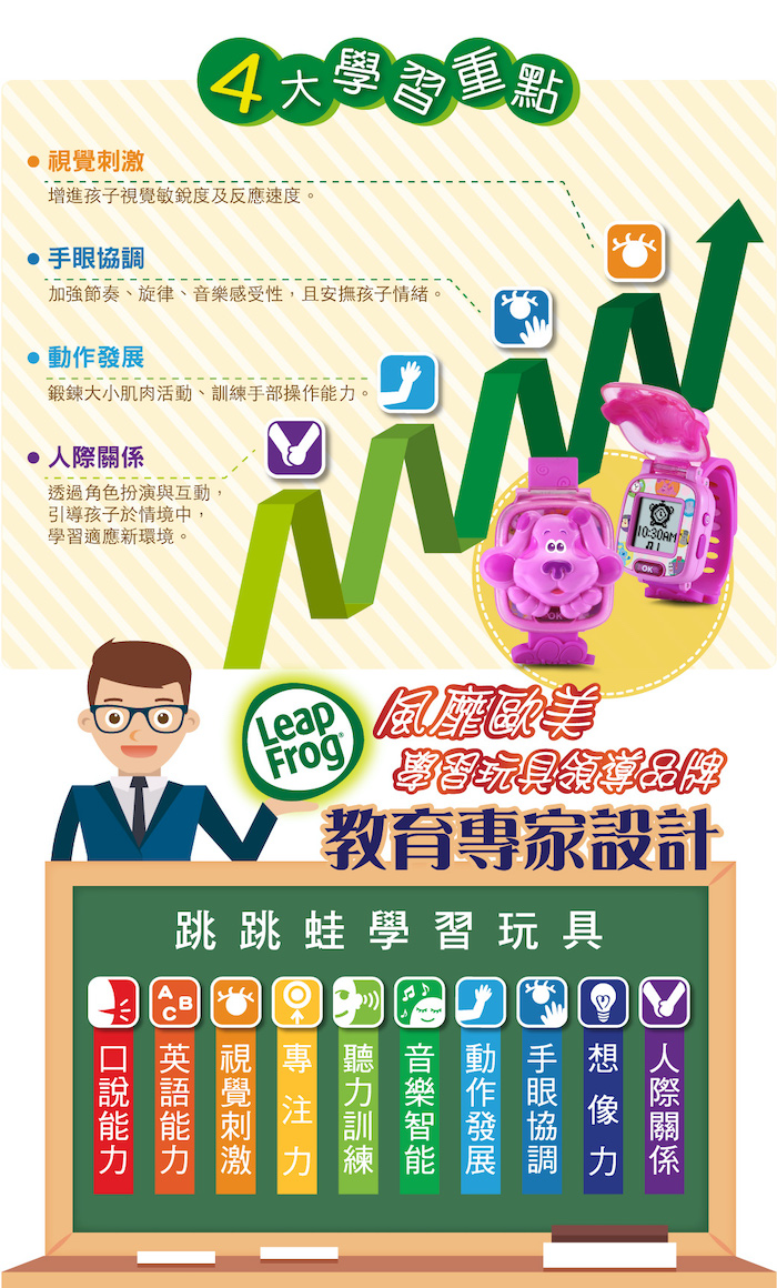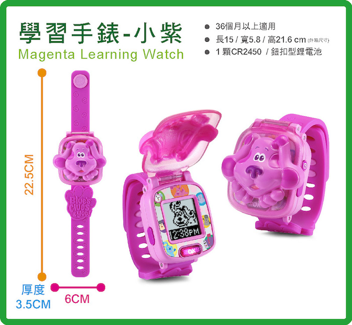 特點:1.學習主題:計數、形狀、邏輯等2. 具備鬧鐘功能3. 全功能手錶,有秒錶和計時器4. 手錶上擁有小紫可愛臉龐。