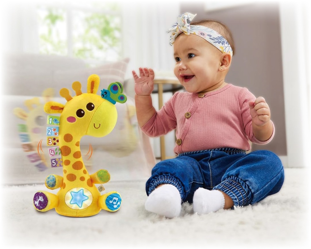 互動歌曲搭配長頸鹿肚子上的彩色燈光效果,幫助幼兒辨識不同顏色,強化視覺刺激與顏色學習