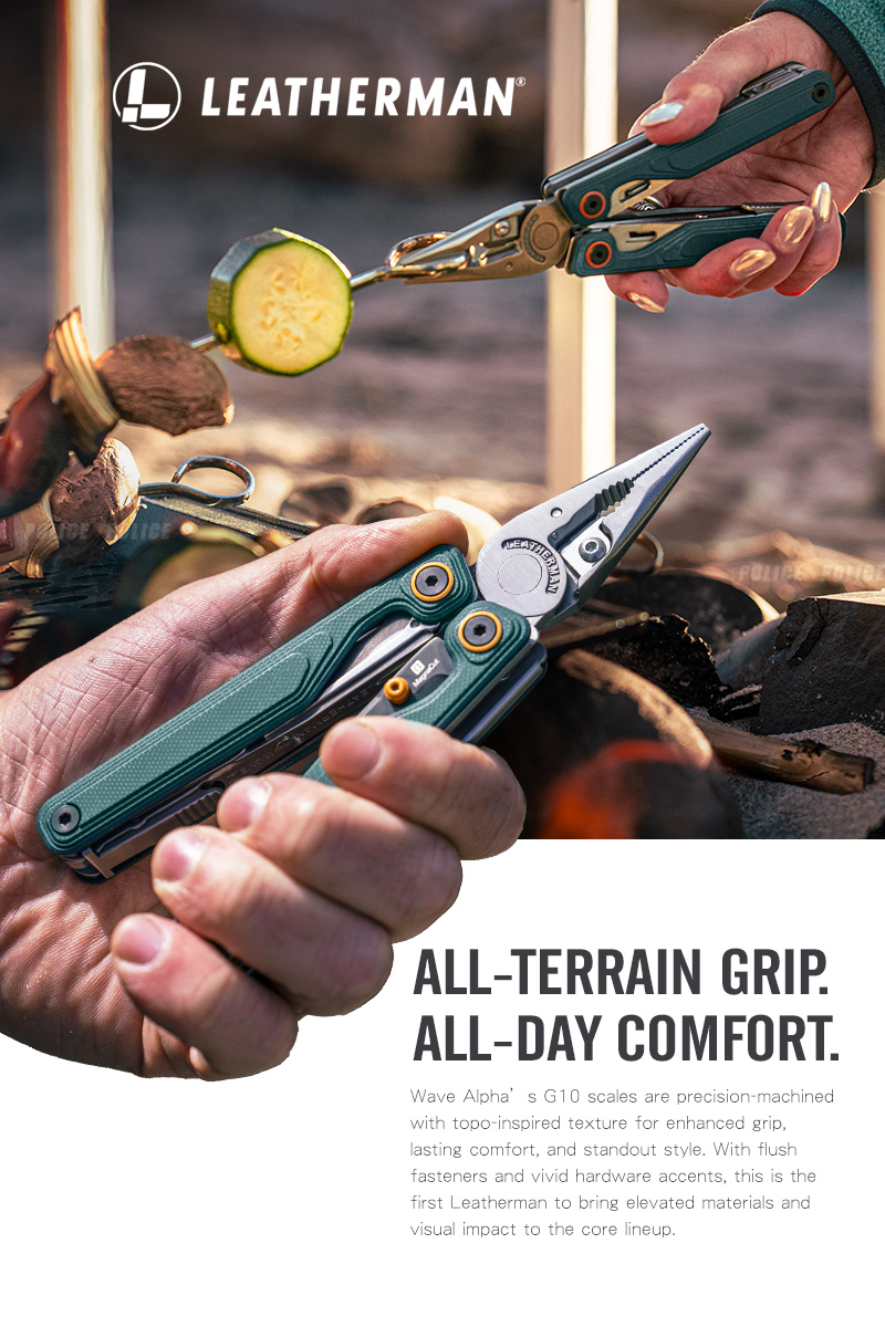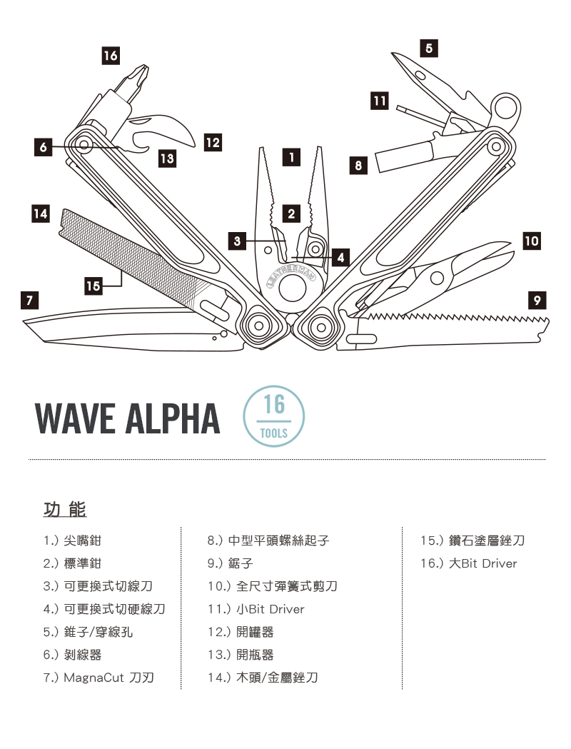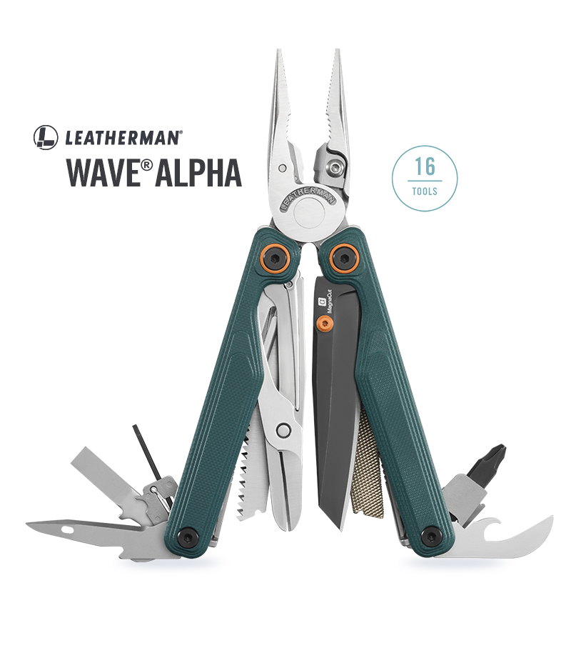 品名:LEATHERMAN Wave Alpha工具鉗_無附收納套/配件(卡司卡地亞綠 )型號/顏色:#833401 / 卡司卡地亞綠尺寸(±10%):合起時全長10.26cm重量(±10%):234g主刀鋼材:黑色氧化 MagnaCut® 不鏽鋼握 材:深綠色G10墊 圈:夕陽色 Cerokote 塗層不鏽鋼拇 指 柱:夕陽色 Cerokote 塗層不鏽鋼