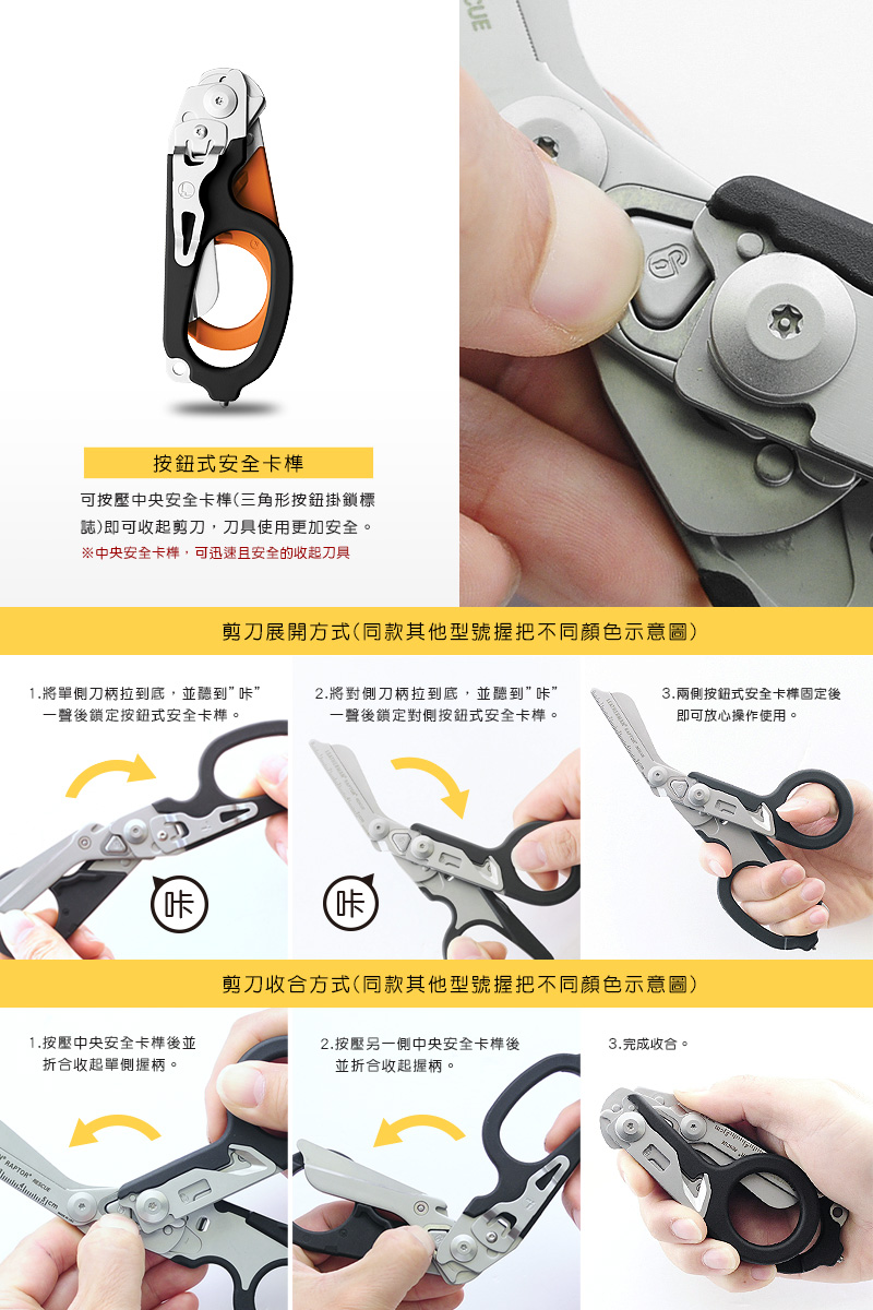 ※本產品說明,僅供參考,請勿作為正式採購招標規格,如有需要,請來電本公司洽詢相關業務人員。※以下原廠提供參考數據。品名:LEATHERMAN RAPTOR® RESCUE 多功能工具剪型號:#832170 (黑橘柄)剪刀刃長(±10%):1.9 in | 4.8 cm收闔長(±10%):5 in | 12.7 cm重量(±10%):160g(不含注塑成型聚合物收納套)功能:》420HC不鏽鋼剪刀》帶子切割器》尺(5cm)》氧氣罐扳手》軟金屬戒指切割器(例:純金或純銀戒指)》碳化鎢玻璃擊碎器特點:》不鏽鋼》25年保固》可更換的口袋夾》玻璃填充尼龍握柄》繫繩孔》MOLLE兼容的注塑成型聚合物收納套※未滿18歲 兒童及少年,請勿購買刀械。