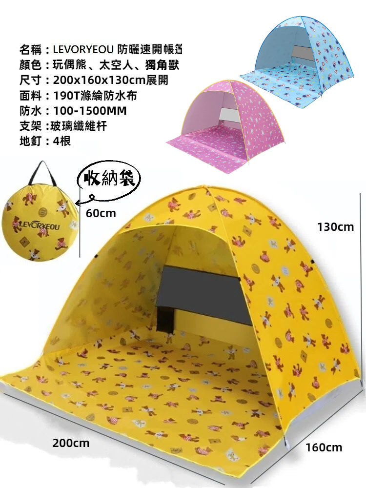 【LEVORYEOU】防曬速開戶外帳篷 贈野餐墊顏色 : 玩偶熊、太空人、獨角獸尺寸 : 200x160x130cm(展開)、直徑60cm(收納)面料 : 190T滌綸防水布防水 : 100-1500MM支架 : 玻璃纖維杆地釘 : 4根重量 : 約1.1kg產地 : China贈品 : LEVORYEOU黃格子野餐墊尺寸 : 200x150cm面料 : 牛津布產地 : China適用於 : 野餐、沙灘遊玩等溫馨提醒 :.商品因手工測量方式不同,存在1-3cm誤差,屬合理範圍。.商品圖檔顏色因電腦螢幕設定差異會略有不同,以實際商品顏色為準,請見諒。