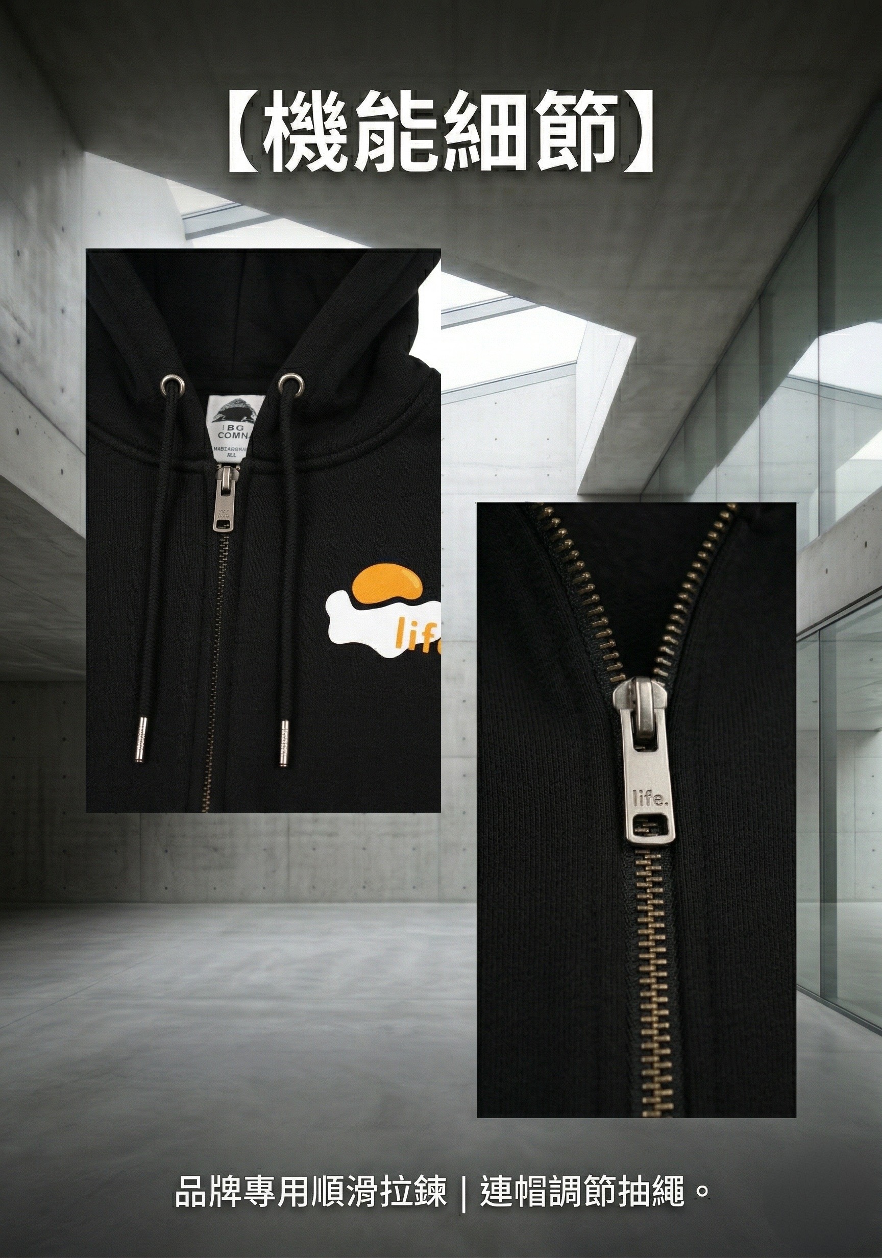 這款連帽外套不僅是日常穿搭的基石,更體現了 LIFE&EGG 追求質感生活的態度。胸前醒目的品牌標誌採用精細印製技術,結合溫潤的面料手感,在休閒與個性之間取得完美平衡。