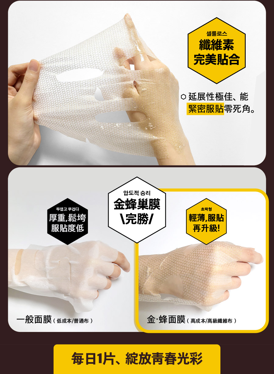 成份:金蜂王乳、金箔、玻尿酸、β葡聚醣、六胜肽、積雪草、維生素B5...等,詳細請見外包裝英文全成份列表。