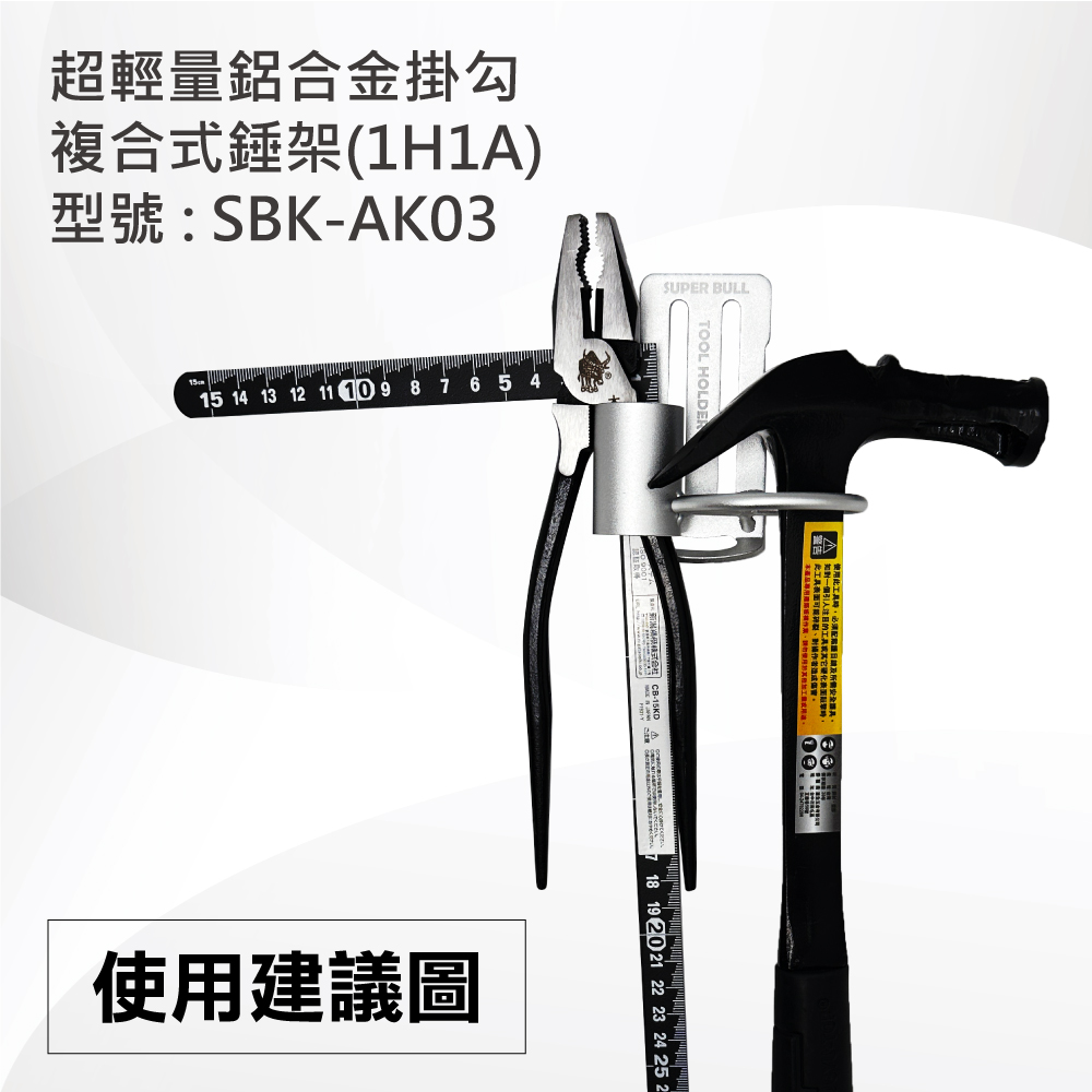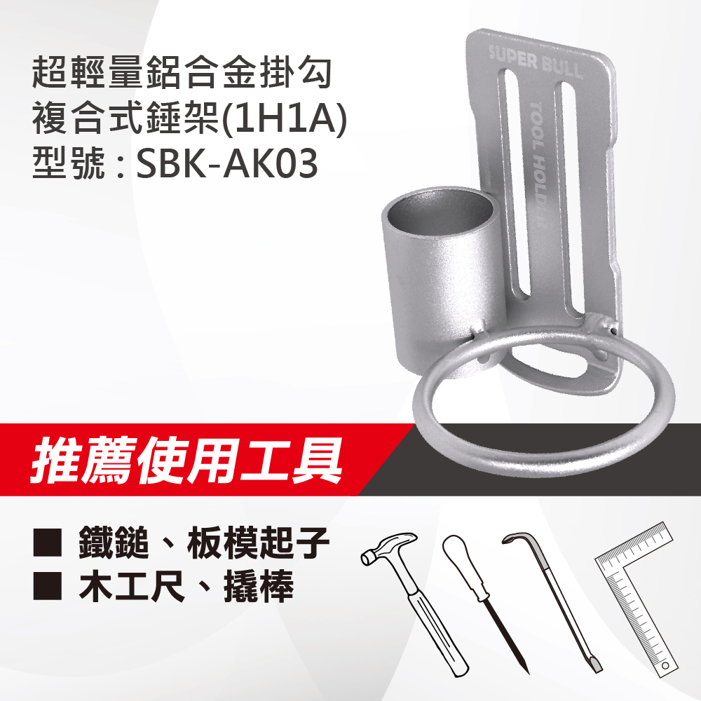 名稱 : 超輕量鋁合金掛勾-複合式錘架(1H1A)型號 : SBK-AK03重量 : 45g推薦使用工具 : 鐵鎚、板模起子、木工尺、撬棒、拆棒