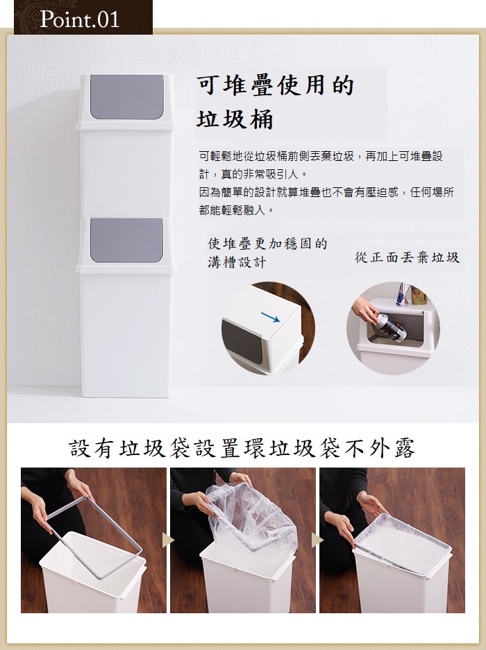 簡約時尚外型,除了是垃圾桶也可以是裝飾品前開式的設計,丟棄垃圾超方便與Like it 可堆疊系列商品可上下堆疊使用,可輕鬆分類垃圾本體內側黑色環狀固定器,安裝垃圾袋好簡單