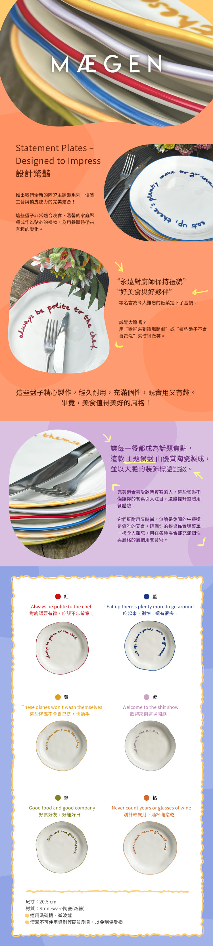 Maegen 全新推出 主題陶瓷餐盤系列,讓日常用餐瞬間升級為話題現場。結合俏皮標語與優質炻器工藝,這些盤子不僅耐用實用,更富幽默與風格。