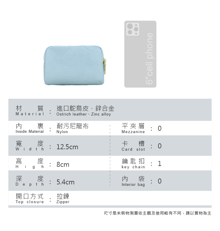 "材質:進口鴕鳥皮+五金扣環 尺寸:12.5*8*5.4cm 配件:保固卡*1 ※備註:預購商品,請以系統出貨日為主 ※其他:一年保固,新品瑕疵 ※鴕鳥皮屬於天然珍稀皮革,每一只包都有獨特的天然動物紋路 ※商品照片僅供參考 請以實品為主 ※尺寸是未裝物測量依主觀及使用略有不同,請以實物為主"