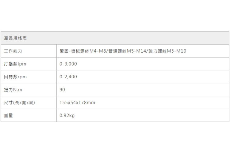 ‧機器螺絲:4~8mm‧普通螺絲:5~14mm‧強力螺絲:5-10mm‧迴轉速:0~2400/rpm‧衝擊數:0~3000/ipm‧電源:鋰電電池BL1015(1.5Ah)‧扭力:90N.m‧長度:155mm‧重量:0.92kg‧附件:充電器DC10WA、起子頭、鋰電BL1015×2