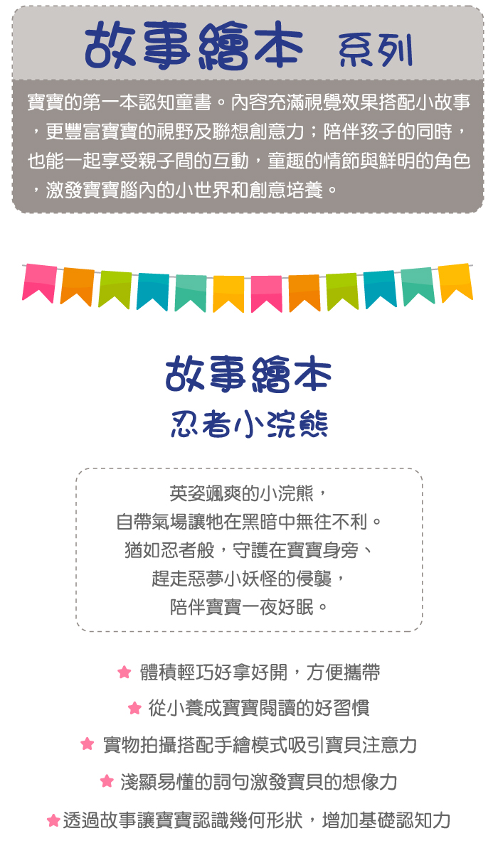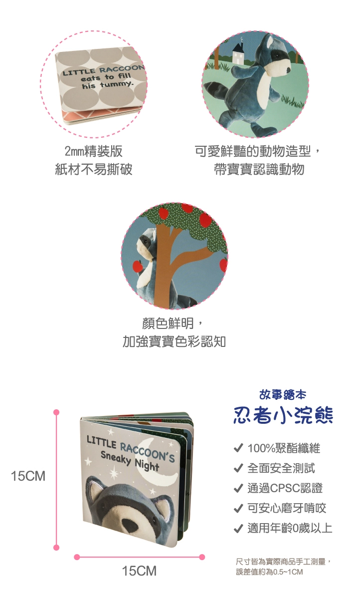 ●貪玩不睡覺的忍者小浣熊,眼睛總是掛著又大又深的黑眼圈。●黑灰色相互點綴,展露出浣熊的機靈與靈巧。●活潑且具互動式的故事內容,讓孩子自由發揮想像力並從小愛上閱讀。●頁數適中的12頁柔軟木板書,不會傷害孩子肌膚,也非常適合作為收藏的入門書籍。
