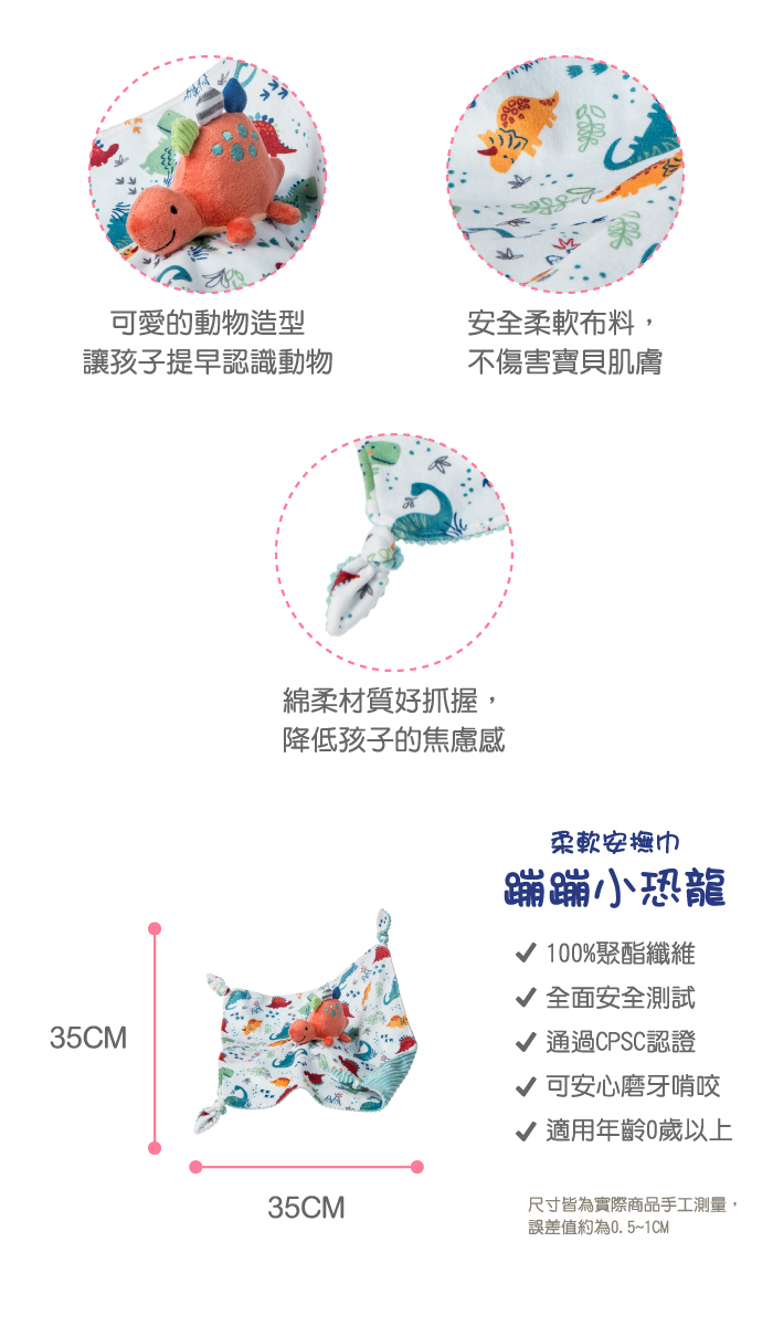 ●蹦蹦小恐龍開心的蹦蹦跳跳,從古代穿越未來,期待來一場跨時空相遇●柔軟材質跟布料的特殊設計讓寶寶輕鬆入睡●纖細柔軟布料不傷害寶寶柔嫩肌膚,有效的安撫寶寶
