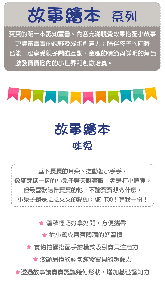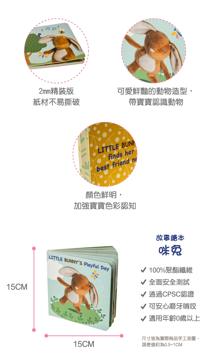 ●咪兔最愛模仿動物朋友們的一舉一動,每當問說你喜歡什麼?想要什麼?它總是回答咪兔。●暖色系的褐色佐以白色點綴,完美顯露出兔子的可愛與優雅。●活潑且具互動式的故事內容,讓孩子自由發揮想像力並從小愛上閱讀。●頁數適中的12頁柔軟木板書,不會傷害孩子肌膚,也非常適合作為收藏的入門書籍。