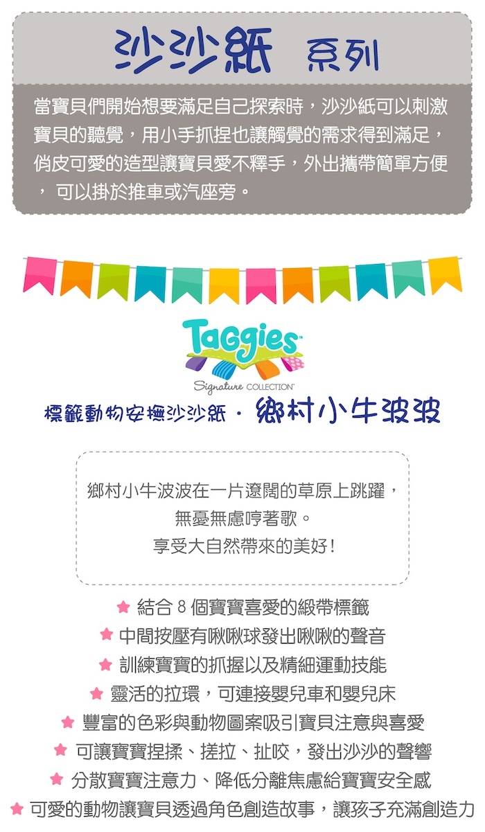 鄉村小牛波波在一片遼闊的草原上跳躍,無憂無慮哼著歌。享受大自然帶來的美好●靈活的拉環,可連接嬰兒車和嬰兒床●有趣可愛的角色圖案,吸引寶寶的好奇與喜愛●結合8個寶寶喜愛的緞帶標籤,提供觸感的刺激●搓揉會有喀擦喀擦的觸感跟聲音,按壓啾啾球會發出啾啾的聲音。刺激寶寶的聽力和訓練小手肌肉