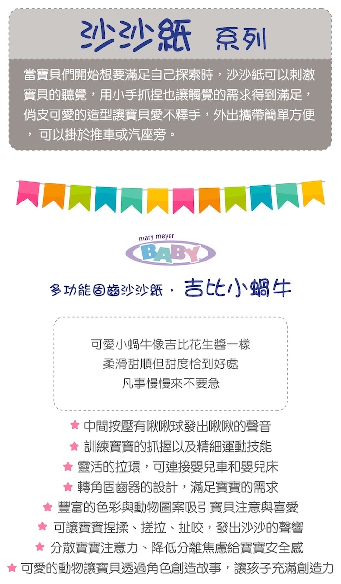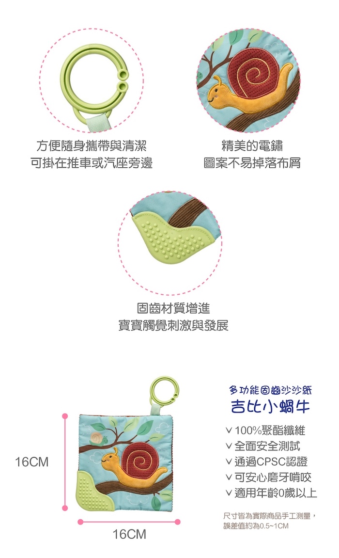 ●可愛小蝸牛像吉比花生醬一樣柔滑甜順,但甜度恰到好處,凡事慢慢來不要急。●靈活的拉環,可連接嬰兒車和嬰兒床,隨身好攜帶。●有趣可愛的角色圖案,吸引寶寶的好奇與喜愛。●搓揉會有喀擦喀擦的觸感跟聲音,中間按壓有啾啾球發出啾啾的聲音。刺激寶寶的聽力和訓練小手肌肉。●安撫寶寶的情緒。●不含BPA,PVC和鄰苯二甲酸鹽等有害物質。●轉角固齒器的設計,讓口腔期的寶寶可以安心恣意的啃咬,滿足寶寶的需求。
