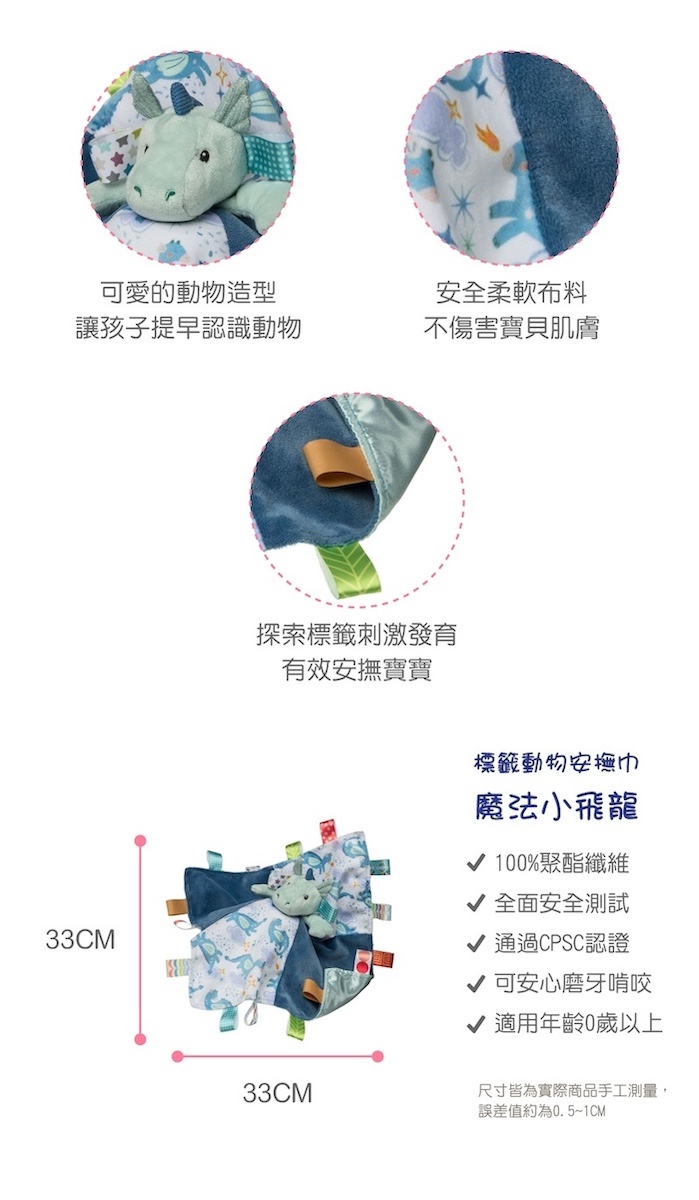 ●歡迎來到魔法世界,勇敢的魔法小飛龍,即將展開牠閃亮的翅膀,帶領孩子飛上天空體驗充滿魅力的景色●淡淡的海藍綠色調陪伴寶寶渡過每個漫漫長夜。●觸感柔軟且帶給寶寶安全感,陪伴寶寶讓他勇敢自行入睡。●許多彩色的緞帶標籤讓人愛不釋手。●造型吸睛的可愛造型設計。●安全柔軟布料,觸感柔軟舒適。●纖細柔軟不傷害寶寶柔嫩肌膚。●探索標籤提供寶寶觸感的刺激。