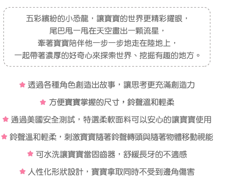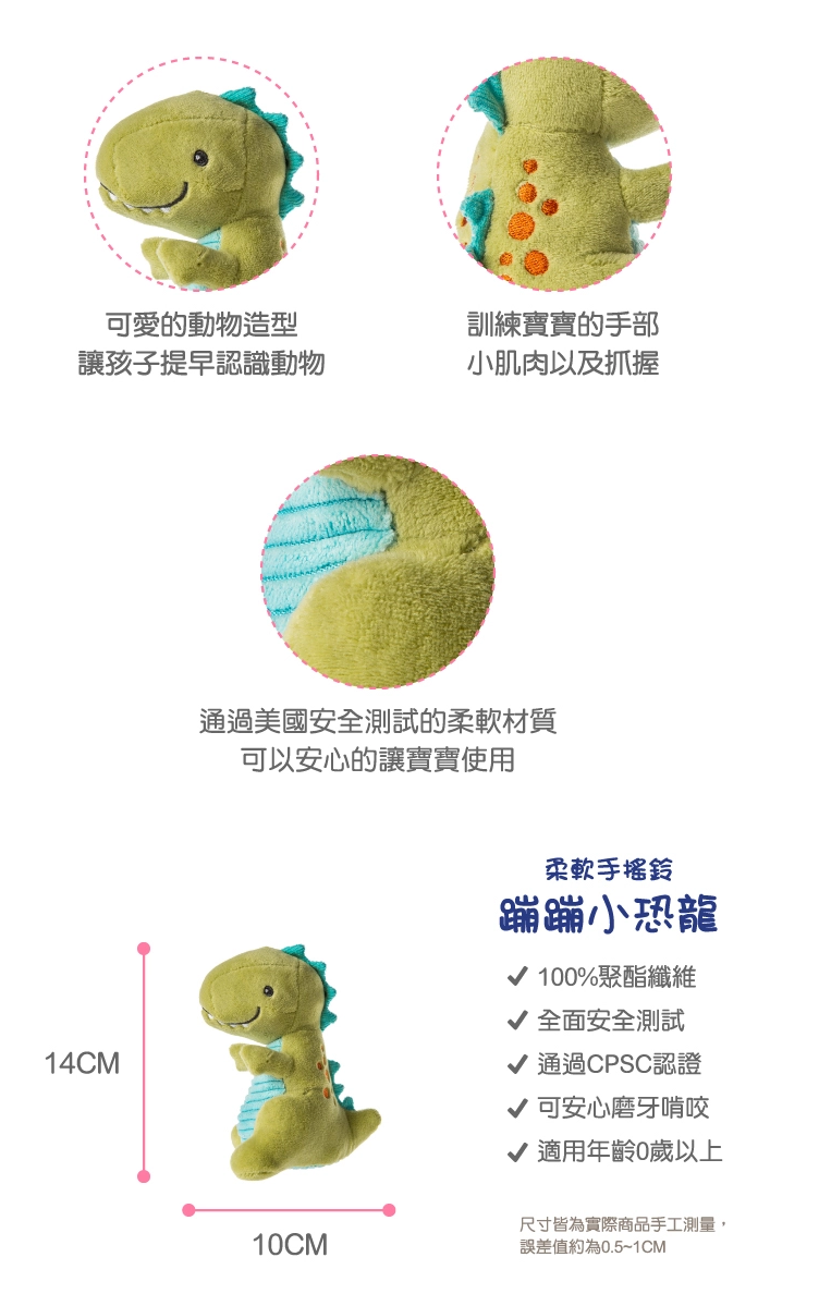 ●蹦蹦小恐龍開心的蹦蹦跳跳,從古代穿越未來,期待來一場跨時空相遇。●柔軟材質跟布料的特殊設計讓寶寶輕鬆入睡。●刺激發育,有效的安撫寶寶。●安全柔軟布料適合孩子抓握●手搖鈴可刺激寶寶聽覺,亦適合寶寶手指動作練習。商檢字號 M38876