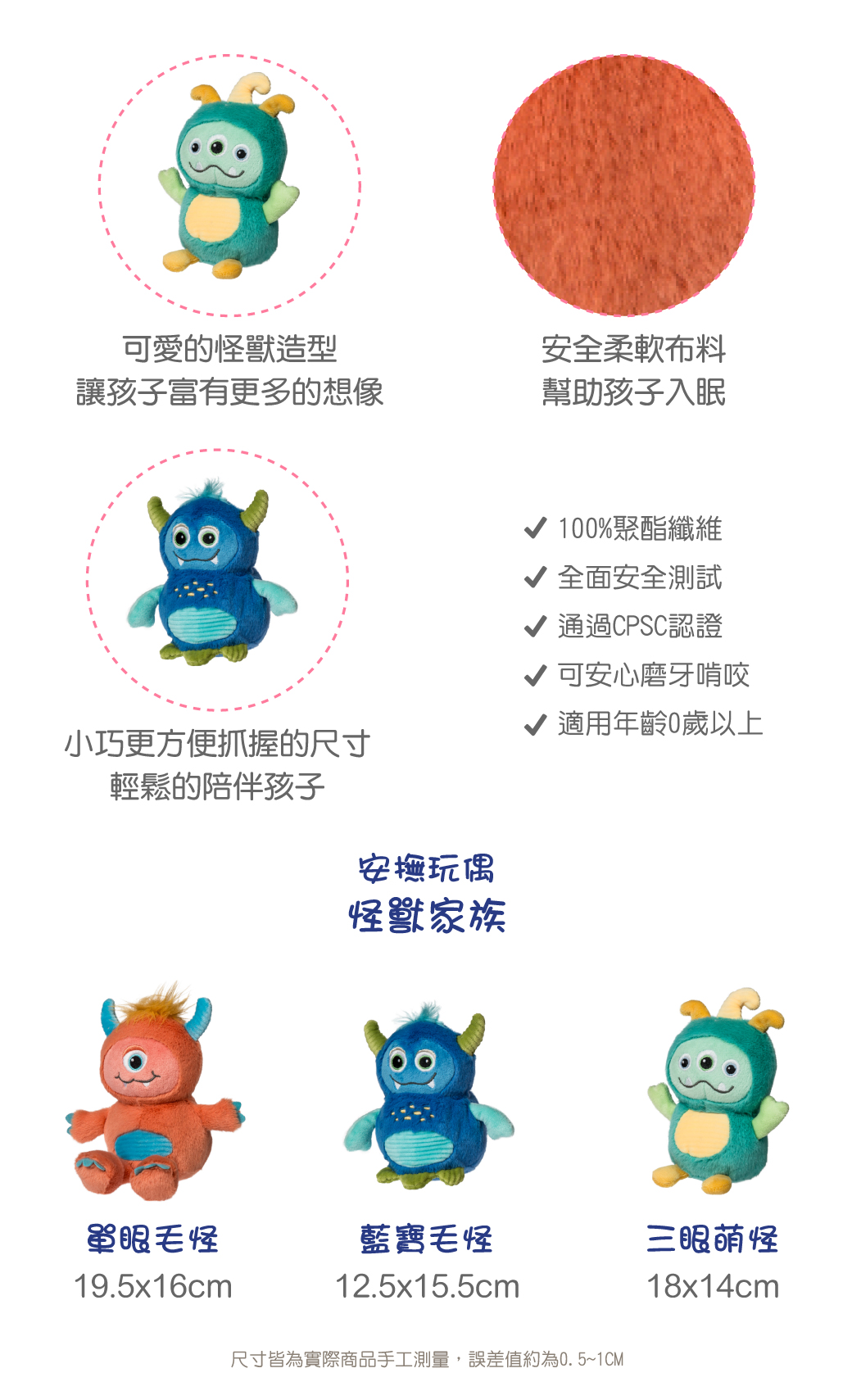 牠們的目標不是趕走噩夢,而是讓每個寶寶在夢裡得到最好的陪伴。●柔軟的觸感帶來滿滿安全感,幫助寶寶勇敢學會自行入睡●頭頂上有著可愛的觸角及柔軟的頭髮。豐富觸感體驗●活潑鮮豔的配色,及刺繡的五官細節,吸引寶寶的注意力●肚子上有條紋設計,底部設計有流動豆豆粒,輕鬆訓練小手的肌肉【商品使用提醒】本產品使用柔軟毛絨布料,觸感親膚舒適,屬於細緻纖維設計。