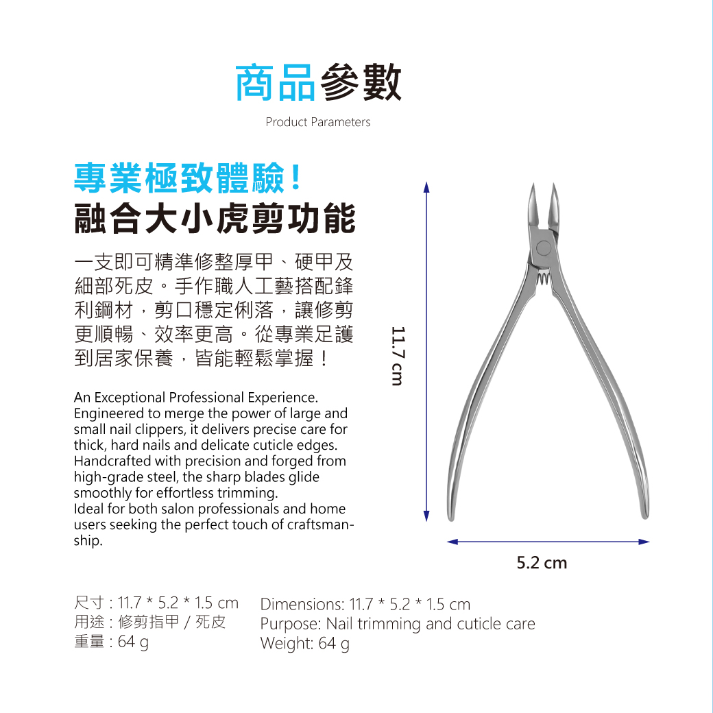 雙虎剪合一設計:結合大虎剪與小虎剪功能,一支搞定厚甲、硬甲與細部修整。