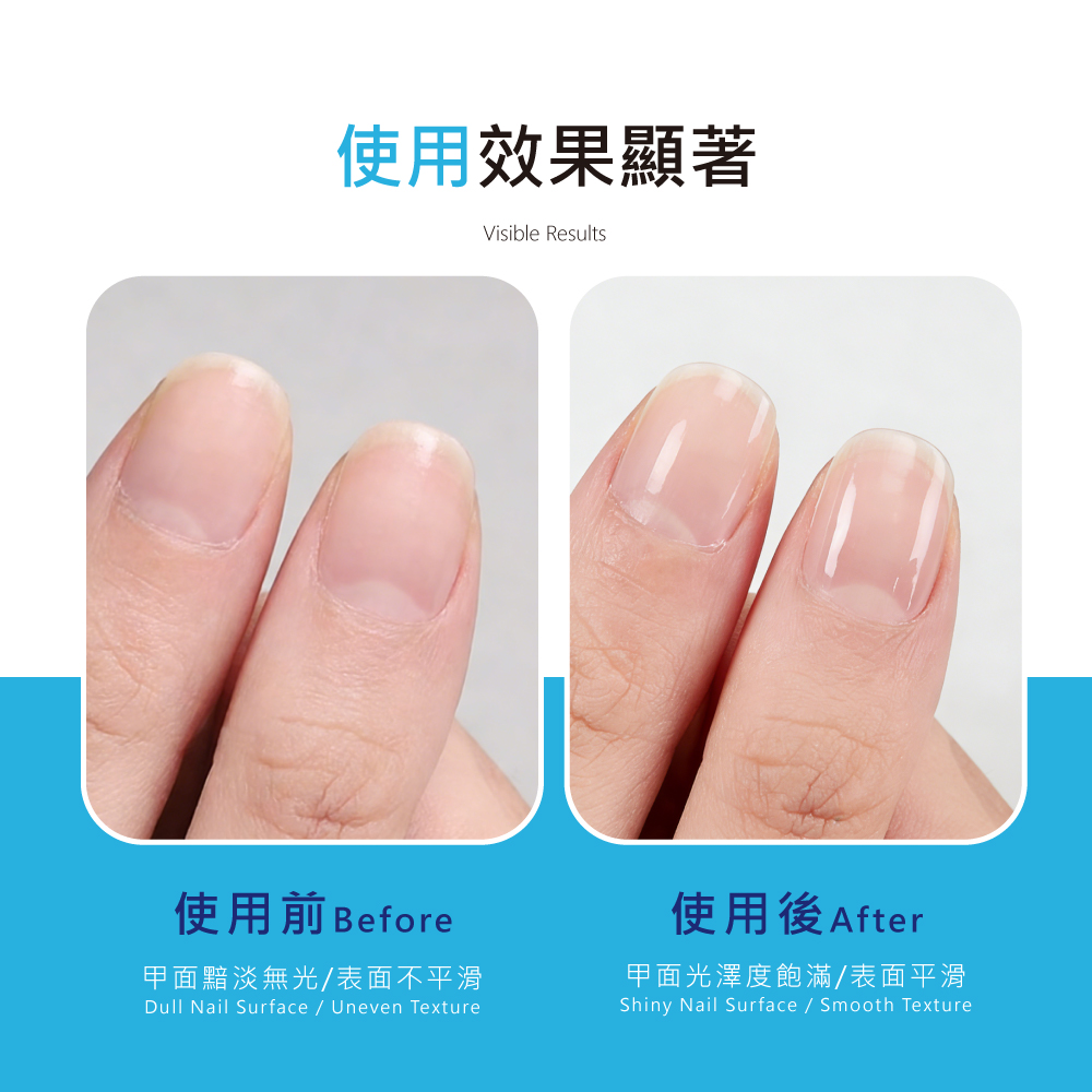 甲面光澤提升系統:透過精油潤澤與拋亮作用,提升甲面反射度,呈現如透明指甲油般的自然光澤。