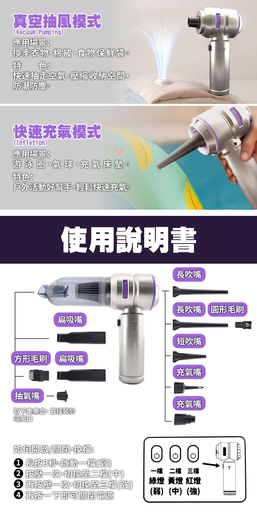 吸塵、吹氣、真空抽風、快速充氣,一機搞定!居家、汽車、露營全方位應用。