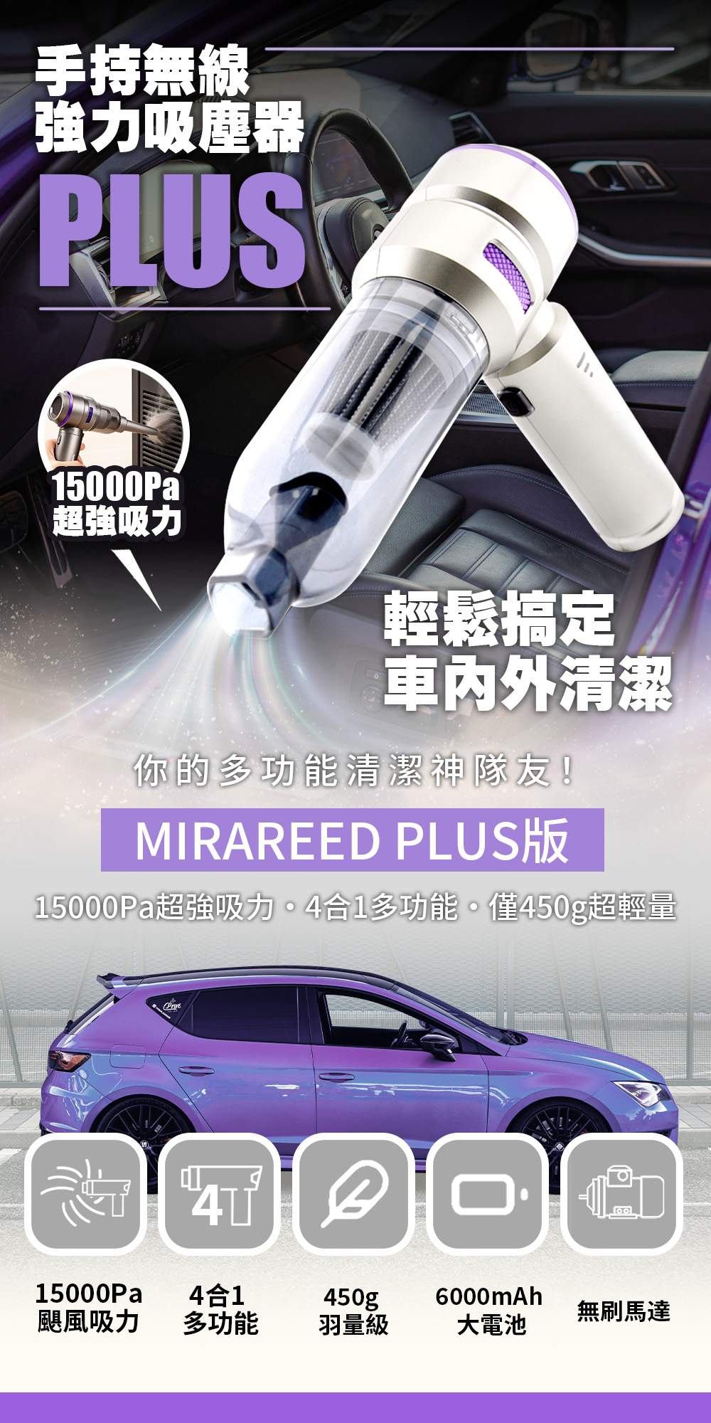 .品名:MIRAREED PLUS版手持無線強力吸塵器.配件:吸塵器x1、吸吹接頭共9種.材質:ABS塑膠、鋰電池、無刷馬達、LED燈.BSMI:R3D178.尺寸:220*70*200mm.電池容量:6000mAh.充電時間:≦4.5小時.重量:450g.吸力:最大15000pa.充電電壓:5V/2A.額定功率:100W.額定電壓:12V/8.9A.保固一年可以更換零主件.產地:日本設計/中國製造