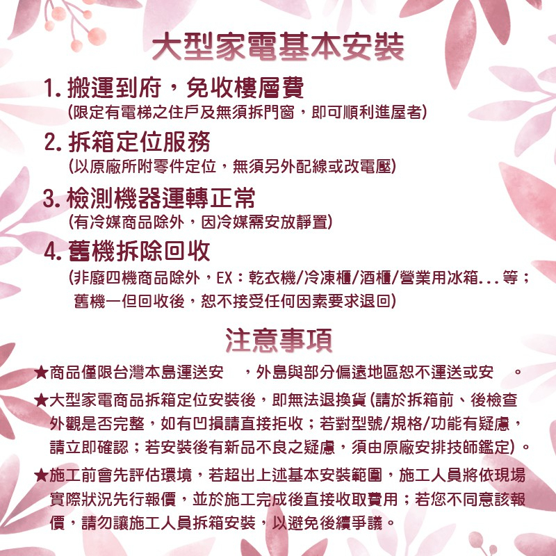 ■ 若要配送安裝請先告知地區、樓層、有無舊機回收(雙北以外地區、偏遠地區、樓層無電梯需另加價)