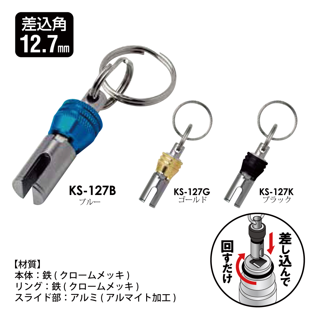 製品番号 品 名 サイズ (mm) 重 量 (g) 総重量 (g) KS-95R インパクト用ソケットホルダー9.5角用レッド 88 × 28 × 16 22 23 KS-95S インパクト用ソケットホルダー9.5角用シルバー 88 × 28 × 16 22 23 KS-127B インパクト用ソケットホルダー12.7角用ブルー 88 × 28 × 16 32 33 KS-127G インパクト用ソケットホルダー12.7角用ゴールド 88 × 28 × 16 32 33 KS-127K インパクト用ソケットホルダー12.7角用ブラック 88 × 28 × 16 32 33