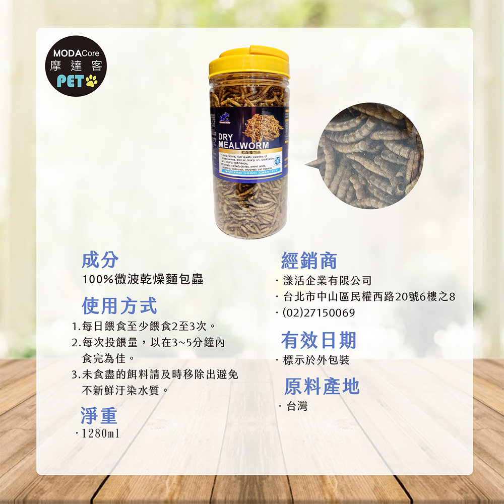 採用天然、優質品種麵包蟲冷風乾燥紫外線殺菌乾早技術加工而成不含人工色素與調味料富含高蛋白