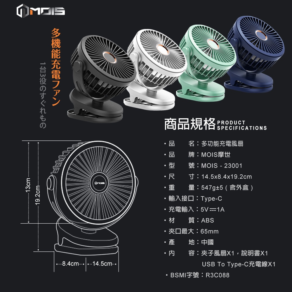 •通過國家級認證,功能規格絕不虛假 •可立可夾可掛,因地制宜,極度適應各種環境 •模擬自然涼風 心不靜也能自然涼 •強力電機高轉速 風勁奔放不間斷 •4檔超足風力 怎麼選都可以找到適合自己的風量 •4種風速,4種模式,睡眠風、自然風、勁風、循環風模式 怎樣吹都很舒服 •靜音微風睡眠模式 媽媽寶寶安穩沉浸美夢之鄉 •超靜音送風 一覺好眠到天亮 •360°無死角降溫 你移動到哪 輕風就跟著到哪 •720°螺旋轉動 送風柔和舒適不刺激 呈風幅度更廣大 •整理造型流動力學設計 符合人體散熱需求 •7200hAm高容量 8小時風流不減 輕鬆放下心浮氣燥 •渦輪扇葉 引流善誘 循環放送清新好空氣 •超便利USB智能充電 電池儲電量大 放電力夠 走到哪都不會怕悶熱 •仿生空氣學+流動力學雙運用科技設計 一款如此貼近人體需求的夾扇 •小巧風扇+可拆卸式方格柵欄 清洗方便 更健康 更安全 •4種流行色彩可自由選擇 時尚好用又愛不釋手 品牌:MOIS摩世 品名:多功能充電風扇 產品型號:MOIS-23001 輸入接口:Type-C 產品尺寸:145mm*84mm*192mm 充電輸入:5V / 1A 產品材質:ABS 產品重量:448g(淨重) /546g(含包裝) 電池電量:7200mAh 包裝配件:夾子風扇*1、USB To Type-C充電線*1、說明書*1 BSMI證號:R3C088 產地:中國 保固:一年