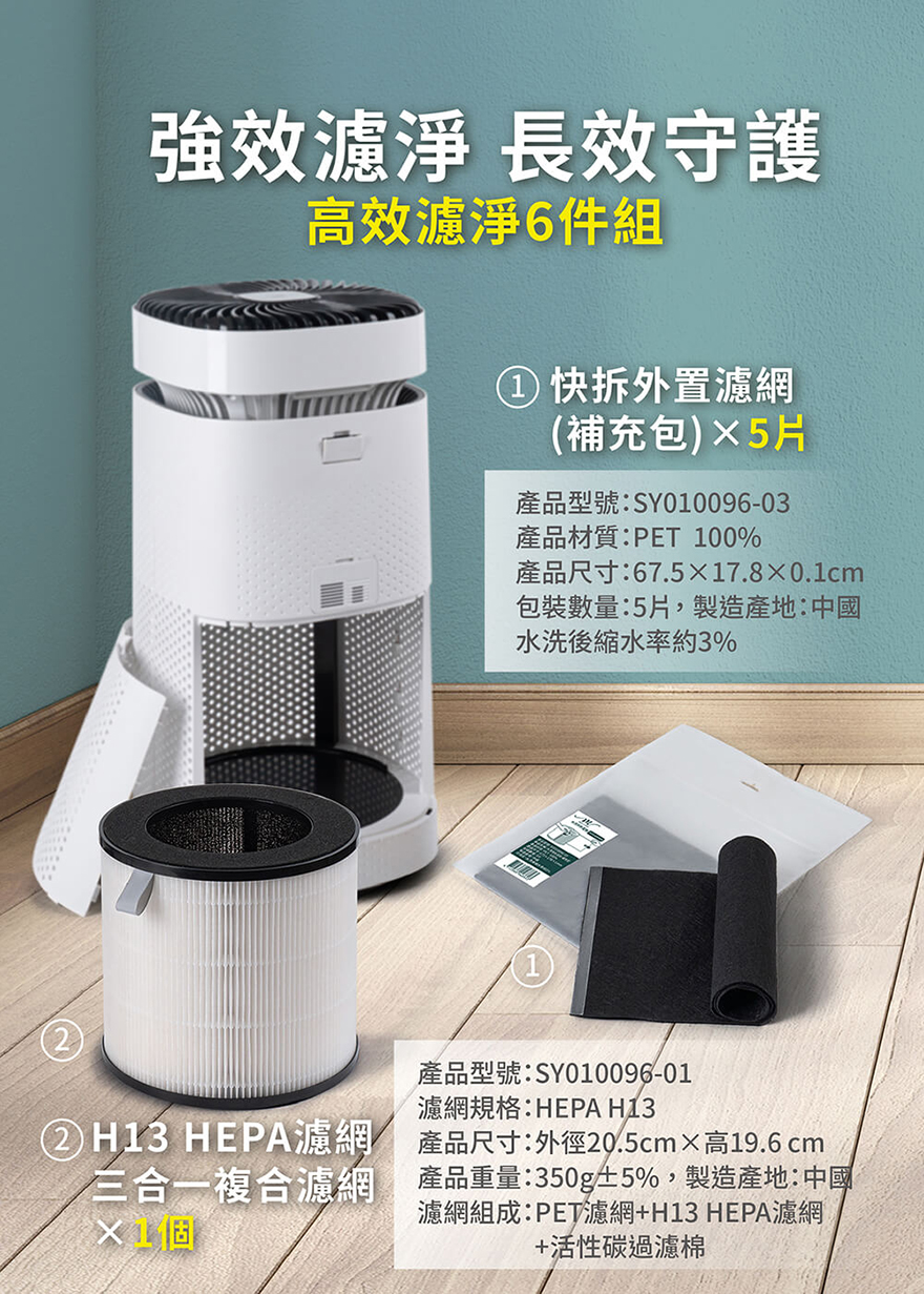濾網組成:圓筒型三層複合過濾 ( 空調PET濾網 + HEPA 濾網(熔噴布)+ 活性碳過濾棉)