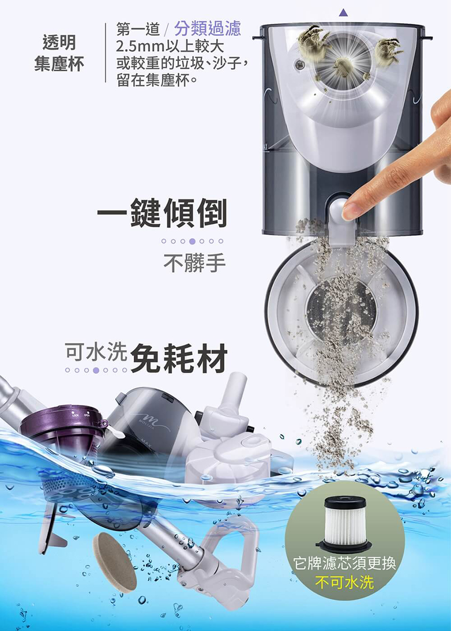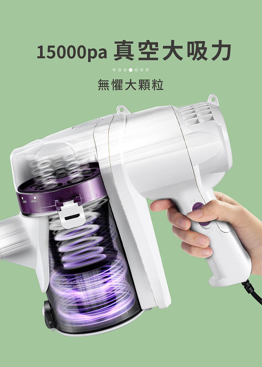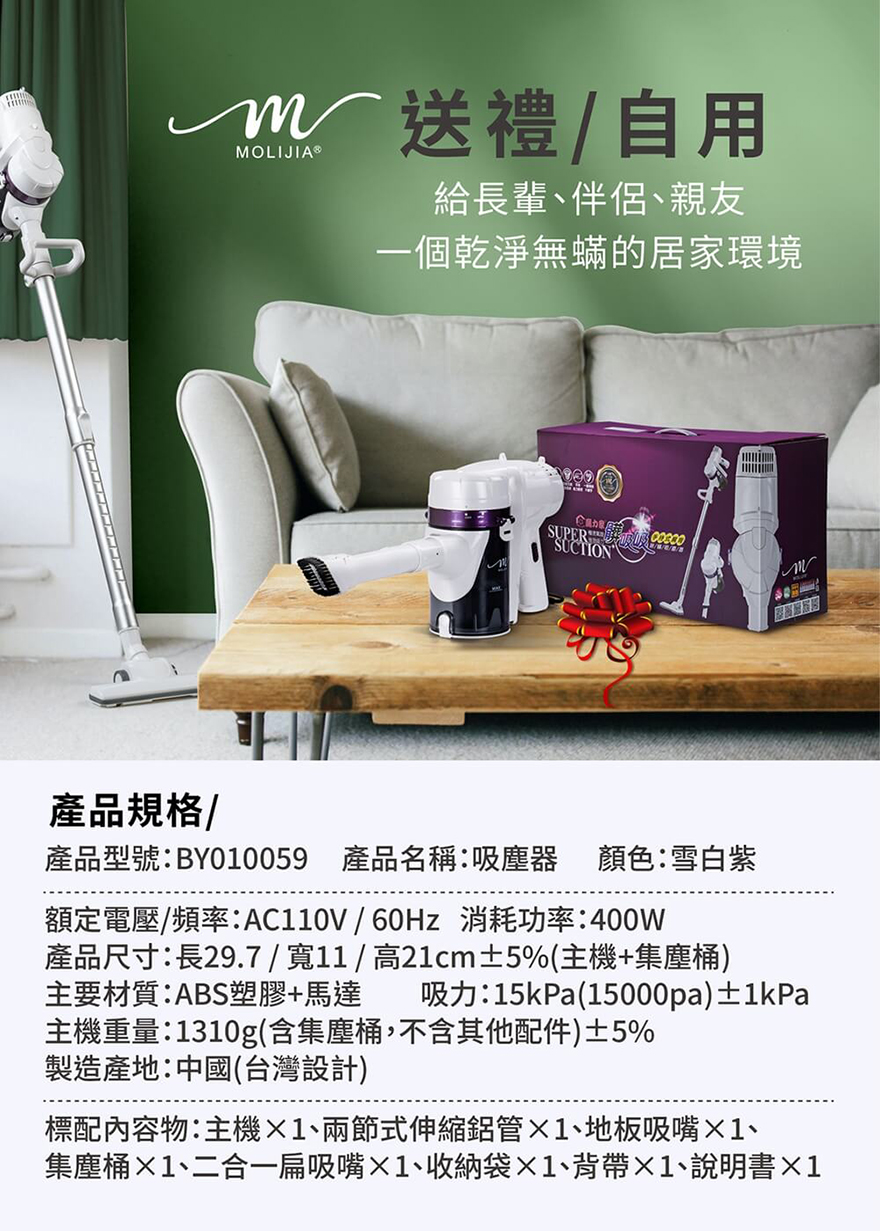 產品型號:BY010059A產品名稱:【MOLIJIA 魔力家】髒吸吸-手持式肩背無塵袋吸塵器產品顏色:雪白紫產品尺寸:長29.7 CM X寬11 CM X高21 CM ±5%(主機+集塵桶)電源線長度: 410 cm ±3%兩節式伸縮管長度: 64cm~42cm ±3%額定電壓/頻率: AC110V/60Hz吸力:15kPa±1kPa (15000Pa)消耗功率:400W主要材質: ABS塑膠+馬達主機重量: 1310 g±5%(含集塵桶,不含其他配件)製造地:中國商檢字號:R53615產品型號:BY010059-SY-6產品名稱:【MOLIJIA 魔力家】髒吸吸-隙縫軟管清潔4件組產品尺寸:軟管:長度63cm ±2cm(直徑最寬3.5cm/最窄3cm)20CM輕巧加長管:長20cm x最寬3.5cm(最窄3cm)x高20cm ±2%(外徑)隙縫清潔吸頭x2:吸管長度15cm,總長度17cm ±2%主要材質:PP、EVA塑膠重量:約200g產地:中國※於購買日期(或製造日期)起算365日內,非人為不當使用的新品故障瑕疵維修,由本公司派車【免費到府收送】維修,所產生的費用由本公司全額負擔。(限台灣本島內收送)※產品在正常使用範圍內,享有自購買日期(或製造日期)起算12個月內,產品零件免費維修更換的保固服務。※顏色:如產品圖示,網頁圖片因拍攝關係,若與實品略有差異,顏色以實際出貨為主。※鑑賞期內如需退換貨,商品本身、贈品、包裝彩盒均務必保持完整齊全。※機器使用中,請勿讓孩童靠近,避免發生危險!※請勿讓本機曝曬在高溫的環境中。※請保持產品本體的乾燥,請勿在潮濕處使用。※使用前請確認所有的部位配件都安裝完畢,確認伸縮管內無異物堵塞後,再開啟主機。※使用時請注意電線安全,避免電線被壓住、纏繞、打結的情況產生,並遠離會加熱 / 發熱的物體(如電熱器等)。※請勿將吸塵器拿去吸燃燒中或是易燃的物體,如香菸、火柴、汽油等等。※產品使用完畢,請把插頭從電源插座上拔下收好,拔下插頭時,請確保手部為乾燥狀態,再進行拔除差頭的動作。※若電源線損壞,請勿自行更換以免發生危險,請立即諮詢客服中心。※若產品發生故障,請關閉主機,拔下電源插頭,勿自行拆卸維修本產品,並立即諮詢客服中心。
