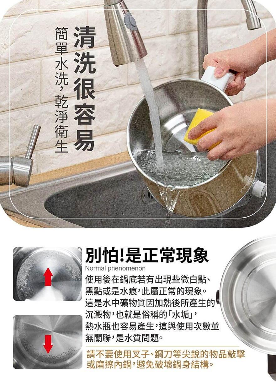 往鍋內倒水時,請注意不要超過最高水位線,避免水滾後噴出、溢出,造成危險!