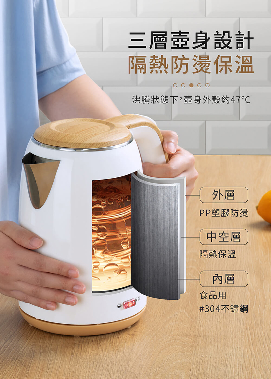 產品名稱:【MOLIJIA 魔力家】M27雙層防燙快煮壺1.9公升/保溫型/木紋款