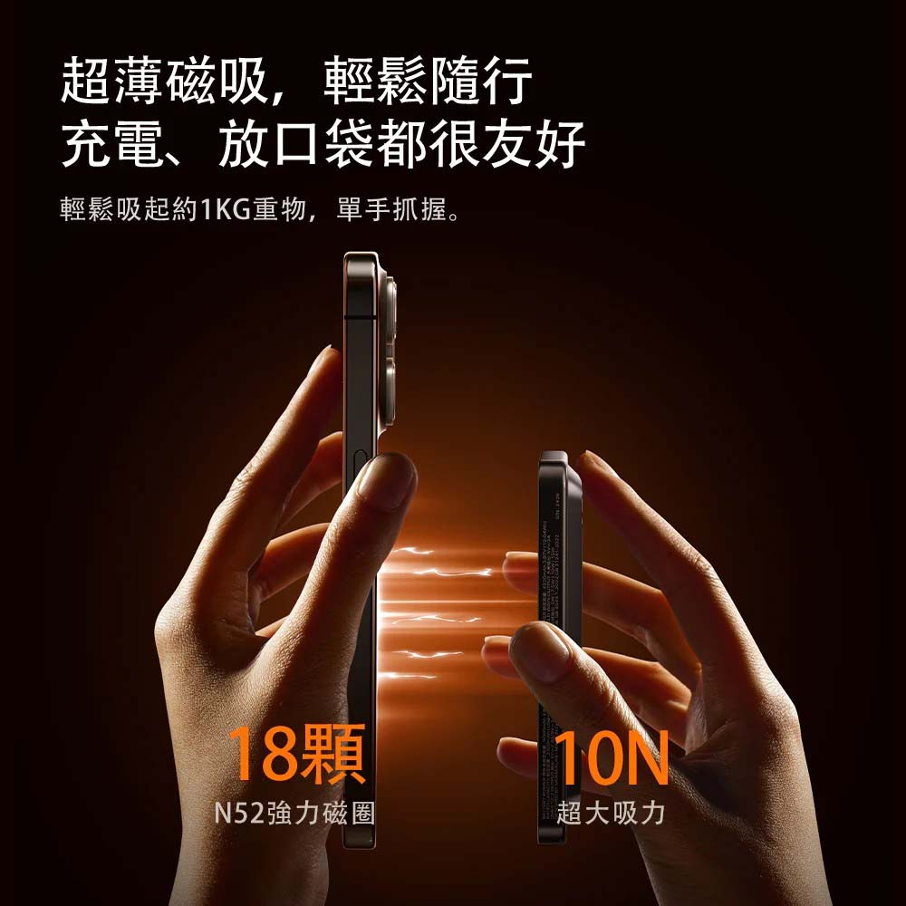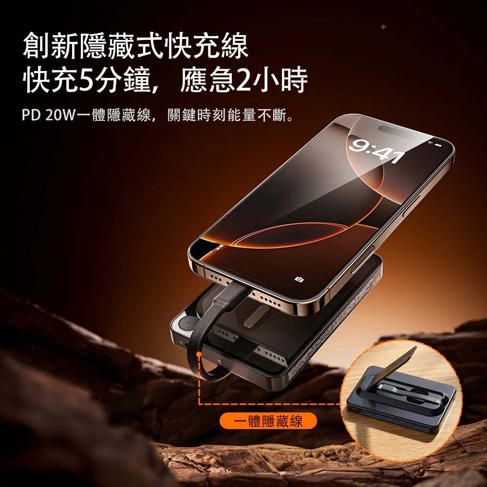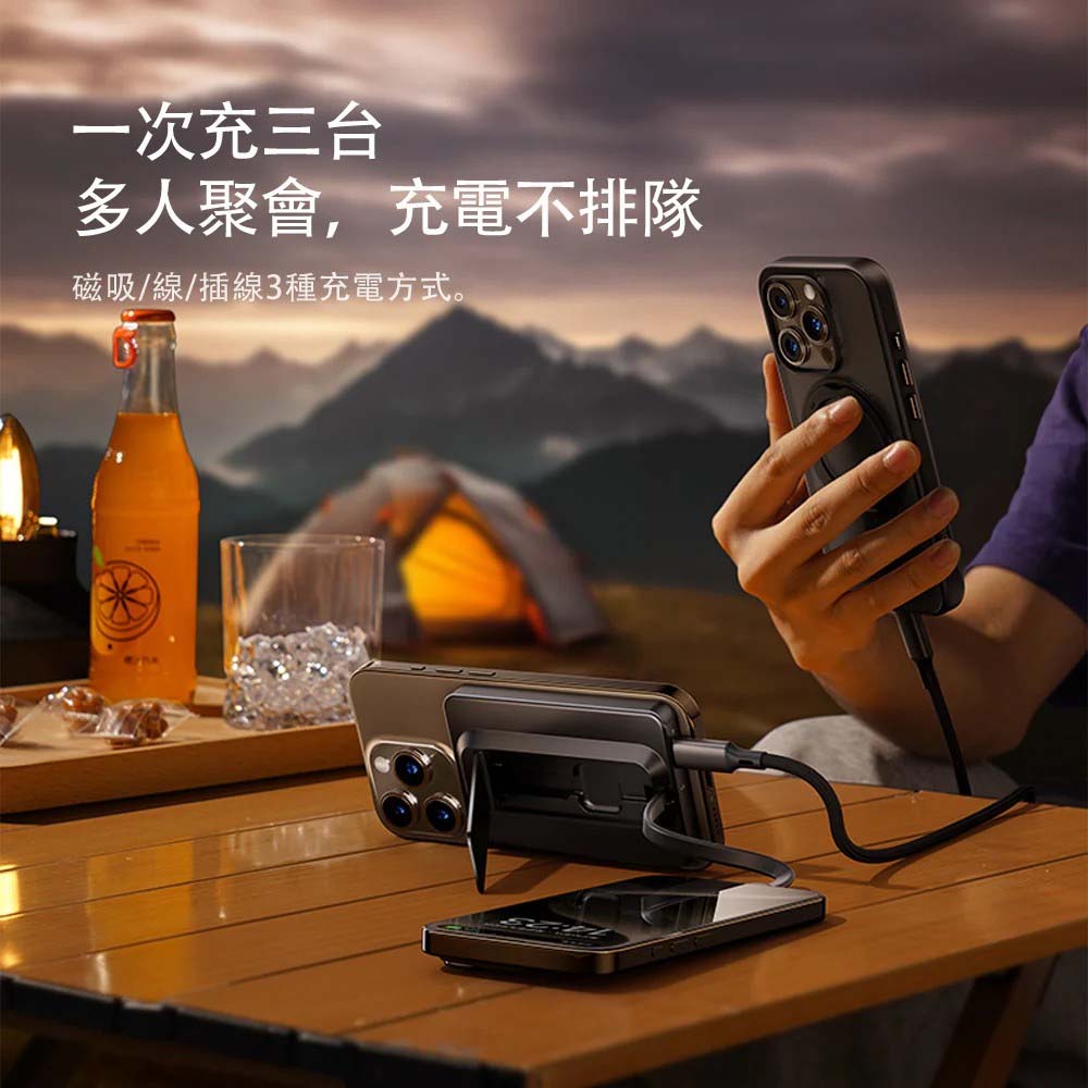 【商品特色】支援MagSafe10000mAh 電池容量20W PD 及 QC 3.0 快速充電同時為最多 3 個裝置充電內建USB-C充電線配置的鋅合金支架,可支撐或無需雙手使用