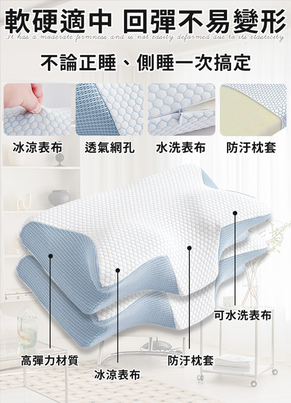 隱藏拉鍊,涼感布套可拆洗,枕芯不可洗滌。