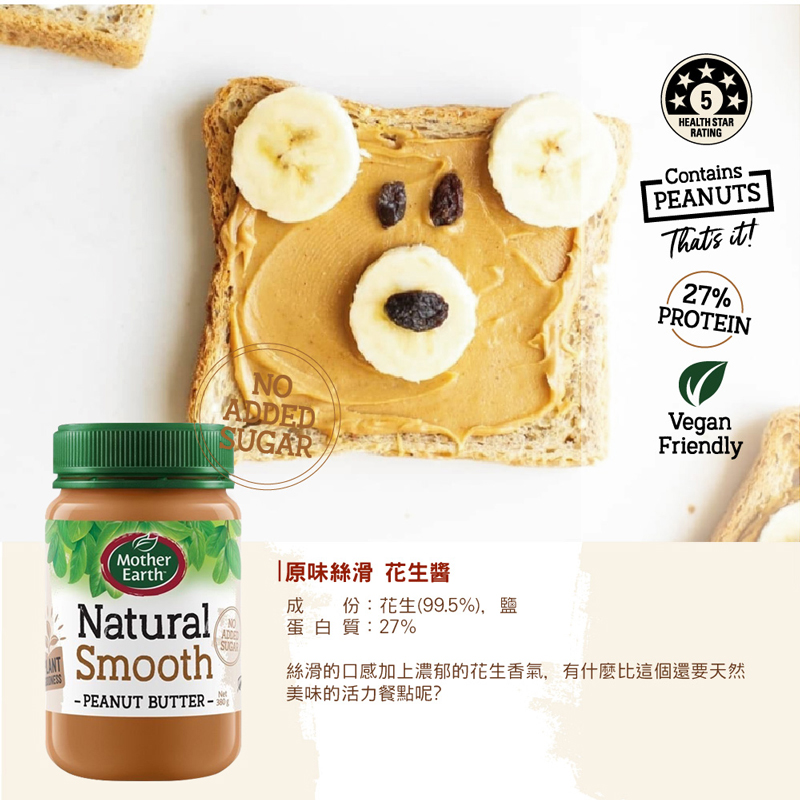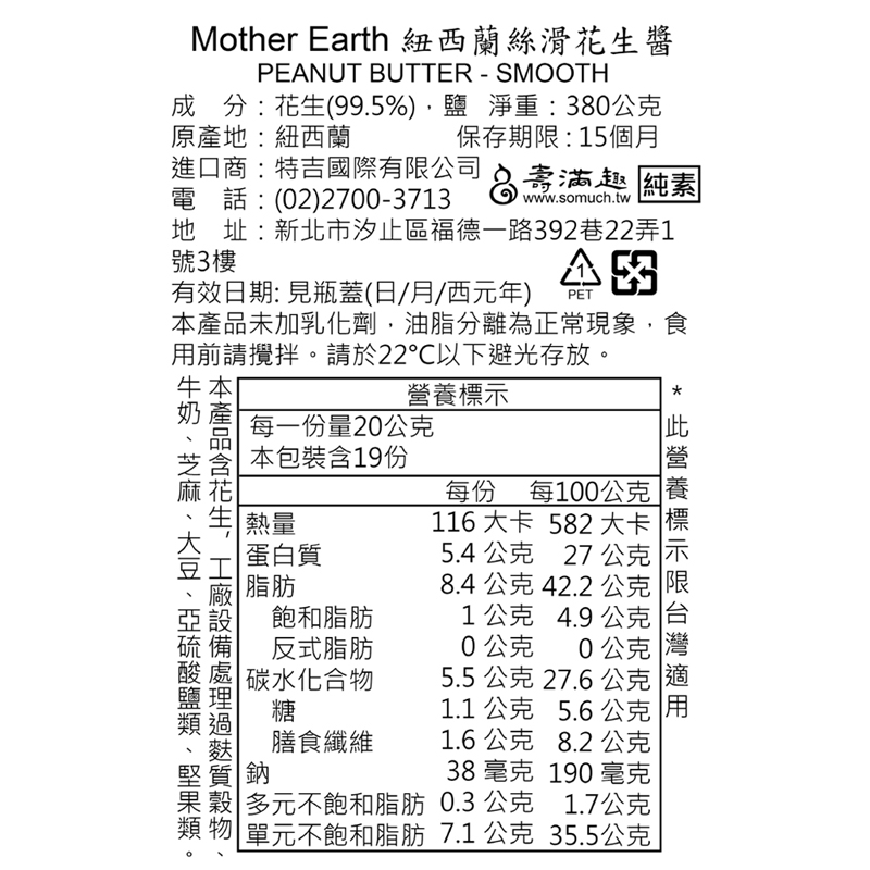 #紐西蘭#絲滑#高油酸#抹醬#涼拌#全素👉 全新包裝,全新式樣,新鮮上架✔採用紐西蘭高油酸花生, 不易變質 不加糖, 無多餘熱量, 只用些許鹽巴帶出花生的香甜 ~✔紐西蘭生產製造, 原裝進口來台, 鄉民熱搜最愛花生醬之一 !✔每一口都充滿香濃花生的顆粒, 卡滋卡滋, 越咀嚼越滿足 ~✔Mother Earth訴求天然, 產品皆極簡單純粹, 源自「大地母愛」👉絲滑口味成分:花生99.5%、鹽細節:絲滑柔順,,口感綿密• 內容規格 : 380g/瓶x3• 保存期限 : 15個月• 有效日期 : 如包裝上所示• 原產地(國) : 紐西蘭• 食用方式 : 可塗抹在吐司或依個人喜好食用 • 注意事項 : 本產品含有花生, 不適合對其過敏體質者食用 • 保存方式 : 置於陰涼乾燥處, 避免陽光直射, 開封後請儘早食用, 以免影響風味 ■ 代理廠商名稱 : 好健康國際有限公司■ 代理廠商電話 : 02-26755234 ■ 代理廠商地址 : 238新北市樹林區千歲街57-7號1樓