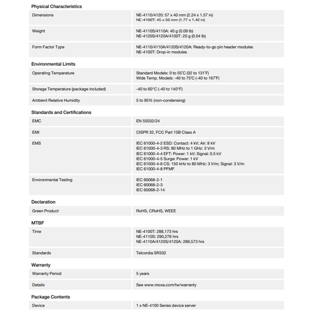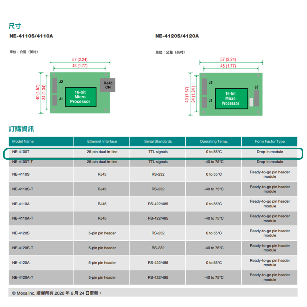 昌運監視器 MOXA NE-4100T 10/100 Mbps內嵌式串列裝置伺服器 26針雙列直插式 TTL訊號