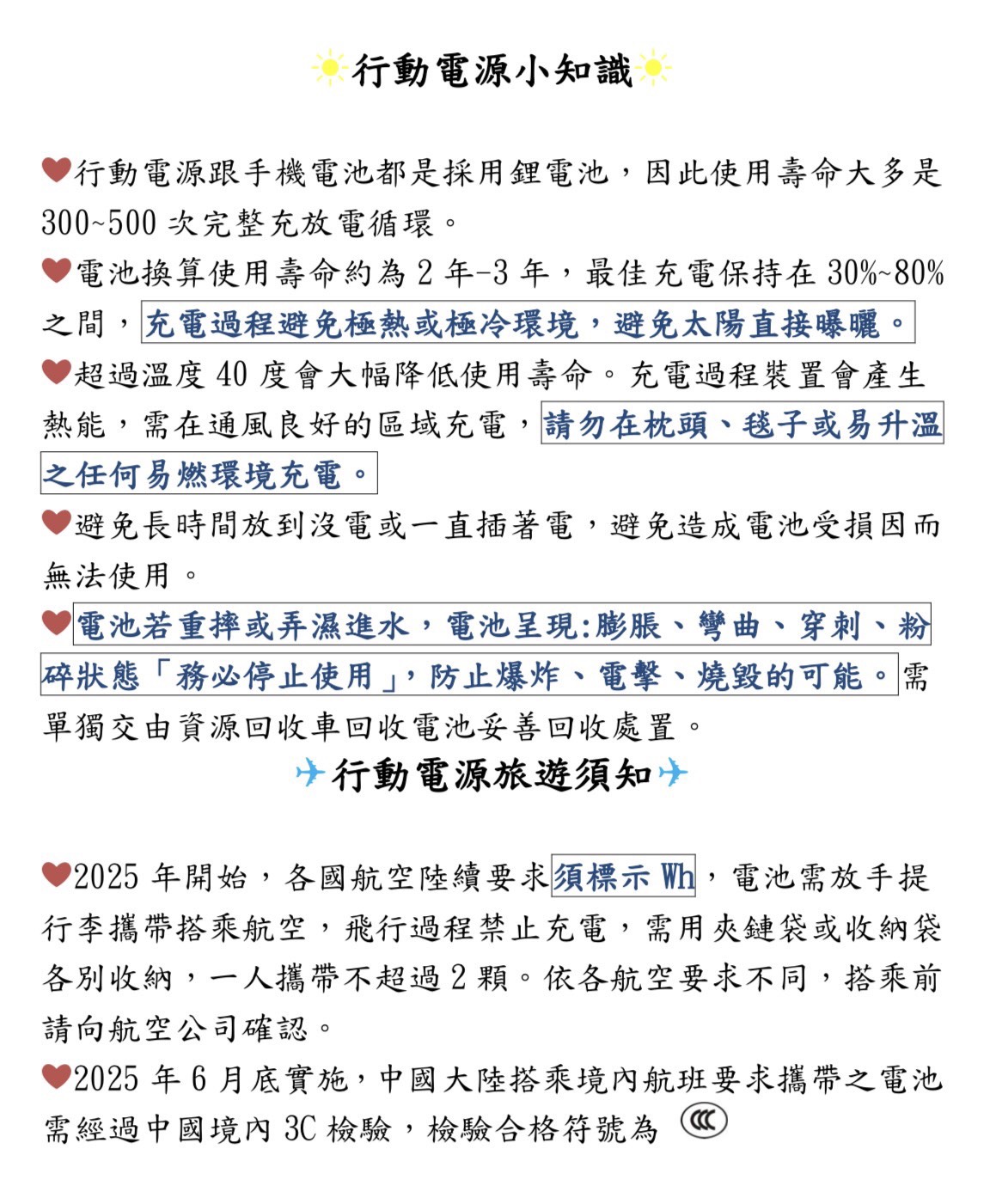 1. 充電時行動電源會產生熱能。需在通風良好的區域充電。請勿在枕頭、毯子或易燃表面上充電。2. 建議環境溫度10~35度中內進行使用,以防止行動電源損壞。3. 讓電源遠離熱源、陽光直射、可燃氣體、溼度、水或其他液體。4. 請勿拆卸、微波、焚燒、油漆或將異物插入電源孔。5. 請勿讓行動電源受到機械衝擊,如粉碎、彎曲、穿刺或粉碎。 避免行動電源掉落地上或是放置重物下方。6. 如電源短路或插座短路,行動電源請勿充電,會因其他導電材質導致商品受損。7. 如果行動電源被弄溼或損壞,請勿操作以防止電擊、爆炸或燒毀。 並聯絡進口商或授權的經銷商進行維修處置。8. 兒童使用行動電源時,須成年人陪同。9. 請閱讀此電源提供的操作說明(包括充電說明以及最低和最高工作溫度的資訊)。