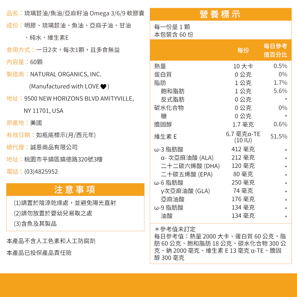 ✳️來自高品質的Omega 3/6/9✳️六種脂肪酸含DHA及EPA✳️琉璃苣油、魚油、亞麻籽油✳️額外添加維生素E✅Ultra Omega 3/6/9 軟膠囊✅內容量:60顆裝✅有效日期:2027/12✅Omega 3/6/9 好處,可以GOOGLE就可以了解唷~~♻️環保輕簡包裝,愛護地球,無法接受請不要下單唷!♻️購買公司貨,隨貨附發票;買的放心,食在安心。【NaturesPlus 天然佳】 台灣總代理