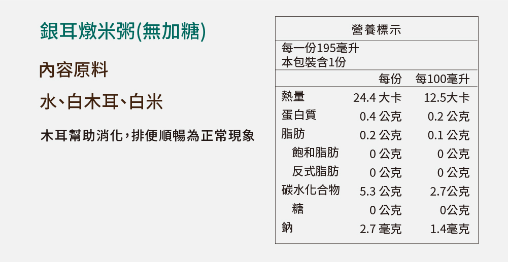 每一份量195毫升,本包裝含1份 -每份- 熱量:24.4大卡 蛋白質:0.4公克 脂肪:0.2公克 飽和脂肪:0公克 反式脂肪:0公克 碳水化合物:5.3公克 糖:0公克 鈉:2.7毫克 -每100公克- 熱量:12.5大卡 蛋白質:0.2公克 脂肪:0.1公克 飽和脂肪:0公克 反式脂肪:0公克 碳水化合物:2.7公克 糖:0公克 鈉:1毫克