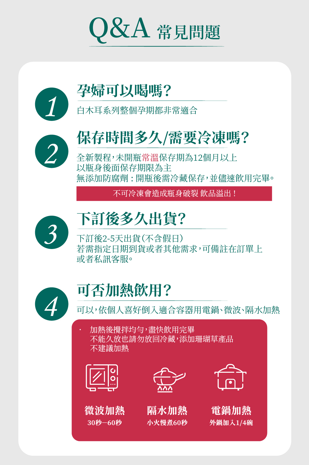 🎖細緻零顆粒木耳、好吸收、膠質高🎖非常時期喝護全家的健康🎖飲食控制最佳神隊友❓常見Q&A❓Q1.孕婦可以喝嗎?A1.白木耳系列整個孕期都非常適合,黑木耳系列建議4個月以上可以定期飲用Q2.保存時間多久?如何保存?A2.全新製成,未開封常溫保存期限約360日左右,以瓶身後面保存期限為主,因飲品皆為無添加,開瓶後建議盡速飲用完畢。Q3.可否加熱飲用?A3.可以,可依照個人喜好倒入適合的容器中,用電鍋、微波、隔水加熱皆可加熱後攪拌均勻盡快飲用完畢,不能久放也請勿放回冷藏🍵加熱建議🍵微波加熱:30-60秒隔水加熱:小火慢煮60秒電鍋加熱:外鍋加入1/4碗水*因產品皆為無添加防腐劑、抗氧化劑、制酸劑,若有遇飲品配達有變質或破瓶情形請立即聯絡客服回收及後續服務☎️客服專線:0800-001-394🗒️LINE:@okasang🤵♀️客服服務時間:一、二 8:30-17:00三、四 、五 8:30-21:00六、日 10:00-21:00