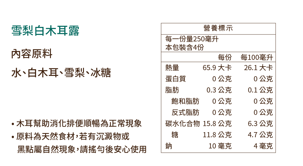 -草莓白木耳露- 每一份量250毫升,本包裝含4份 -每份- 熱量:97大卡 蛋白質:0.3公克 脂肪:0.1公克 飽和脂肪:0公克 反式脂肪:0公克 碳水化合物:24公克 糖:12.7公克 鈉:62毫克 -每100毫升- 熱量:39大卡 蛋白質:0.1公克 脂肪:0公克 飽和脂肪:0公克 反式脂肪:0公克 碳水化合物:9.6公克 糖:5.1公克 鈉:25毫克 -雪梨白木耳露- 每一份量250毫升,本包裝含4份 -每份- 熱量:65.9大卡 蛋白質:0公克 脂肪:0.3公克 飽和脂肪:0公克 反式脂肪:0公克 碳水化合物:15.8公克 糖:11.8公克 鈉:10毫克 -每100毫升- 熱量:26.1大卡 蛋白質:0公克 脂肪:0.1公克 飽和脂肪:0公克 反式脂肪:0公克 碳水化合物:6.3公克 糖:4.7公克 鈉:4毫克 -蜂蜜檸檬白木耳露- 每一份量250毫升,本包裝含4份 -每份- 熱量:95大卡 蛋白質:0.5公克 脂肪:0公克 飽和脂肪:0公克 反式脂肪:0公克 碳水化合物:23公克 糖:17.5公克 鈉:3毫克 -每100毫升- 熱量:38大卡 蛋白質:0.2公克 脂肪:0公克 飽和脂肪:0公克 反式脂肪:0公克 碳水化合物:9.2公克 糖:7公克 鈉:1毫克