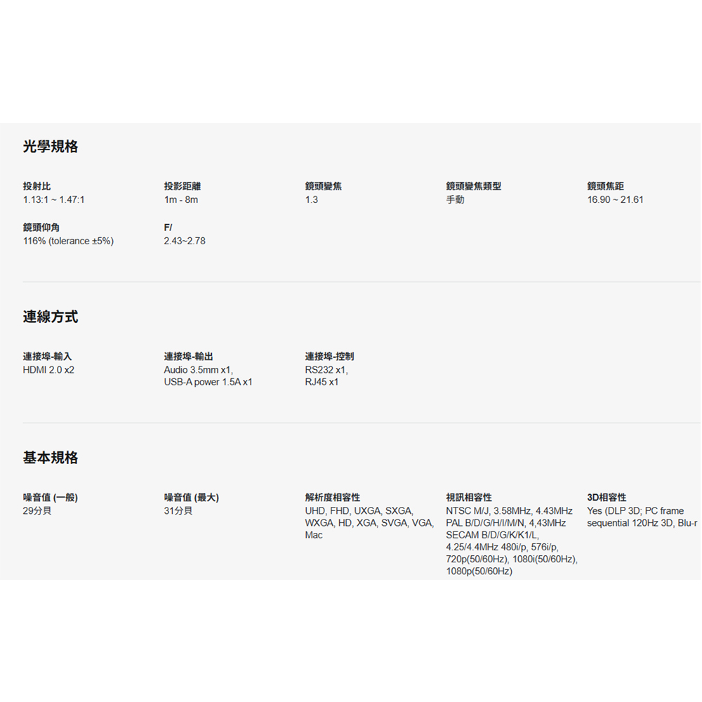 高亮度畫面表現,Full HD 1080p,相容4K及HDR訊源,Amazing colour,超低維護成本,支援雙HDMI輸入,支援CEC裝置控制,整合式音響,Full 3D 支援,OMS管理套件(Optoma Management Suite),四角修正,360 度投影,側立投影功能。