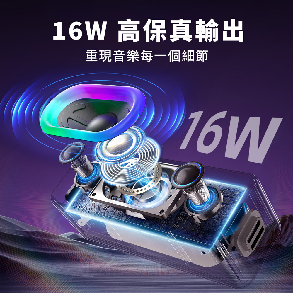 🔸 戶外便攜設計 | 輕鬆攜帶隨時享樂🔸 16W高保真輸出 | 重現音樂每一個細節🔸 TWS無線串聯 | 雙喇叭配對立體音效🔸 RGB炫彩燈效 | 隨節奏變化更添氛圍🔸 24H長效續航 | 播放一整天不中斷🔸 IPX6防水等級 | 防潑水防雨淋戶外適用