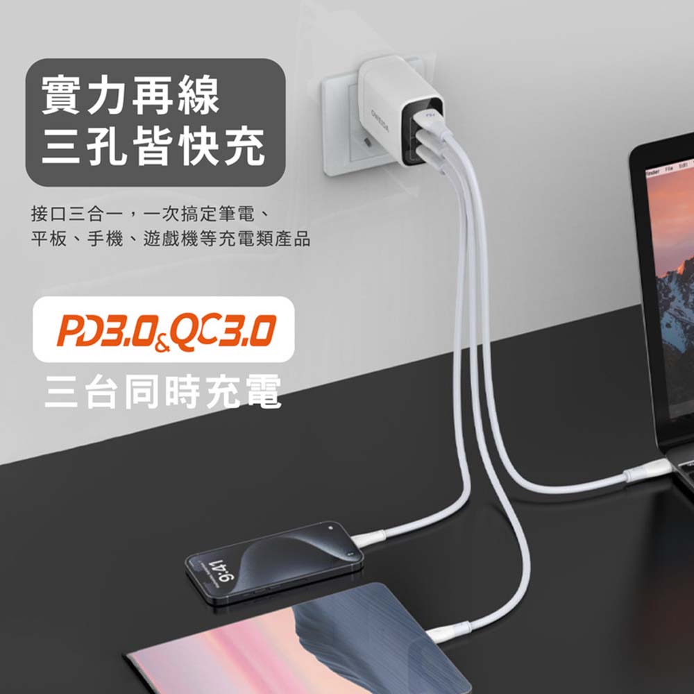 型號 : UT-67W材質 : PC防火塑膠+金屬傳導體輸入 : 100-240V ~ 50/60Hz 1.8A輸出 :TypeC-C1: 5V/3A ; 9V/3A ; 12V/3A ; 15V/3A ; 20V/3.35A (Max:67W)TypeC-C2: 5V/3A ; 9V/3A ; 12V/3A ; 15V/3A ; 20V/3.35A (Max:67W)USB-A: 5V/3A ; 9V/3A ; 12V/2.5A ; 15V/2A ; 20V/1.5A (Max:30W)PPS: 3.3V-21V/3A總輸出 : TypeC-C1+TypeC-C2 : 45W+20WTypeC-C1: 5V/3A ; 9V/3A ; 12V/3A ; 15V/3A ; 20V/2.25ATypeC-C2: 5V/3A ; 9V/2.22A ; 12V/1.67ATypeC-C1+USB-A:45W+18W ; TypeC-C1: 5V/3A ; 9V/3A ; 12V/3A ; 15V/3A ; 20V/2.25A ; USB-A: 5V/3A ; 9V/2.0A ; 12V/1.5ATypeC-C1+TypeC-C2+USB-A: 45W+15W ; TypeC-C1: 5V/3A ; 9V/3A ; 12V/3A ; 15V/3A ; 20V/2.25A ; TypeC-C2+USB-A:5V/3A