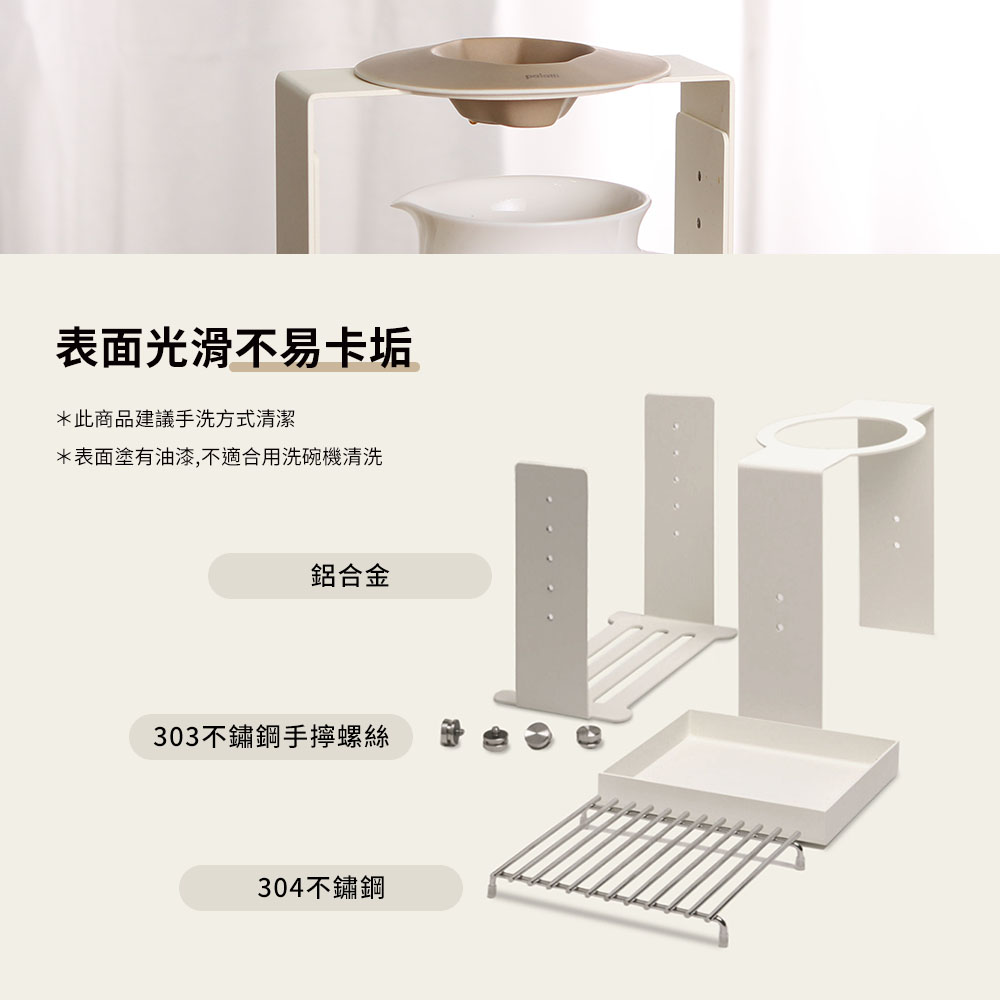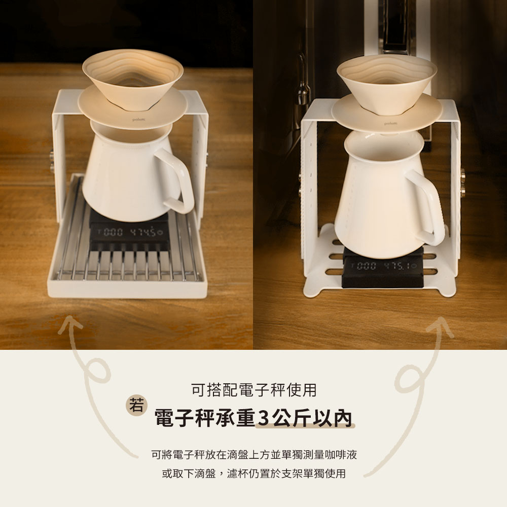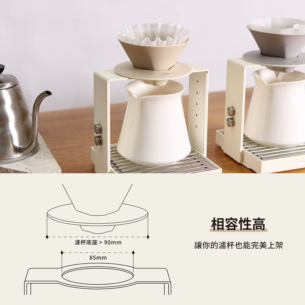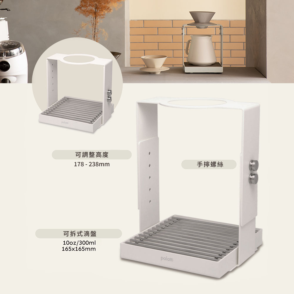 【palatti】Contact咖啡沖煮支架,由高品質的鋁合金和不鏽鋼製成,將 CNC精密加工與手工拋光相結合,為您的咖啡沖泡儀式提供卓越的工藝、耐用性和優雅。Contact咖啡沖煮支架可進行4段高度調整,客製化調整沖煮高度,不僅適用於不同款式濾杯類型和沖煮習慣,亦可用於電子秤和整體沖煮高度的設置,可拆式的滴盤,由鋁合金製成,容量為300毫升,可拆式滴盤和支架底座均配有防滑矽膠墊,確保穩定性並保持乾淨沖煮空間。