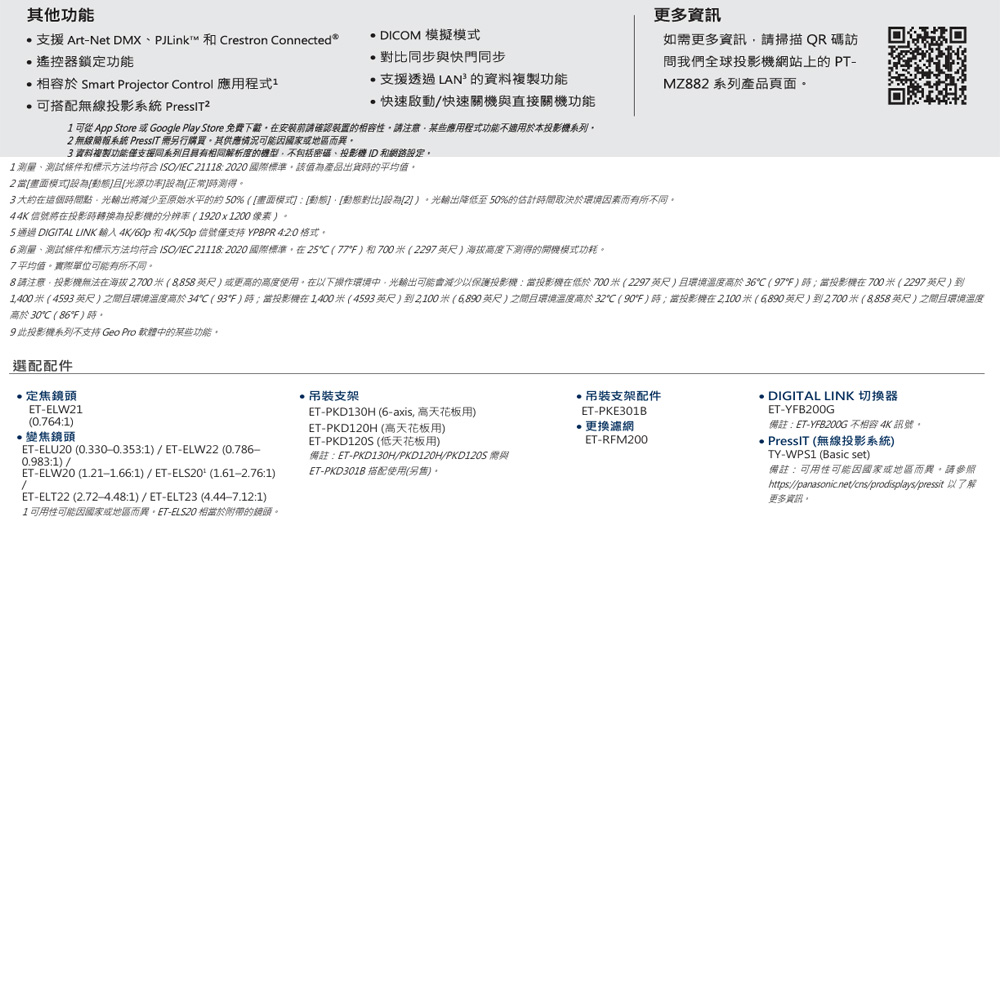 2.效率改進:PT-MZ882(8200流明,最大功耗465瓦,17.6流明/瓦)與PT-MZ880(8000流明,最大功耗490瓦,16.3流明/瓦)相比,效率提高了8%。