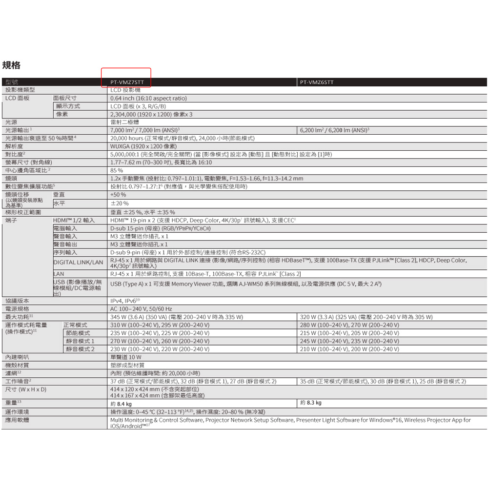 7.在該時間點,光輸出將減少至約原始亮度的 50%([PICTURE MODE] 設定為 [DYNAMIC]、[DYNAMIC CONTRAST] 設定為 [2]、環境溫度為 30°C、海拔 700 公尺、懸浮微粒濃度為 0.15 mg/m³)。實際光衰時間依環境條件而異。濾網清潔週期:20,000 小時(懸