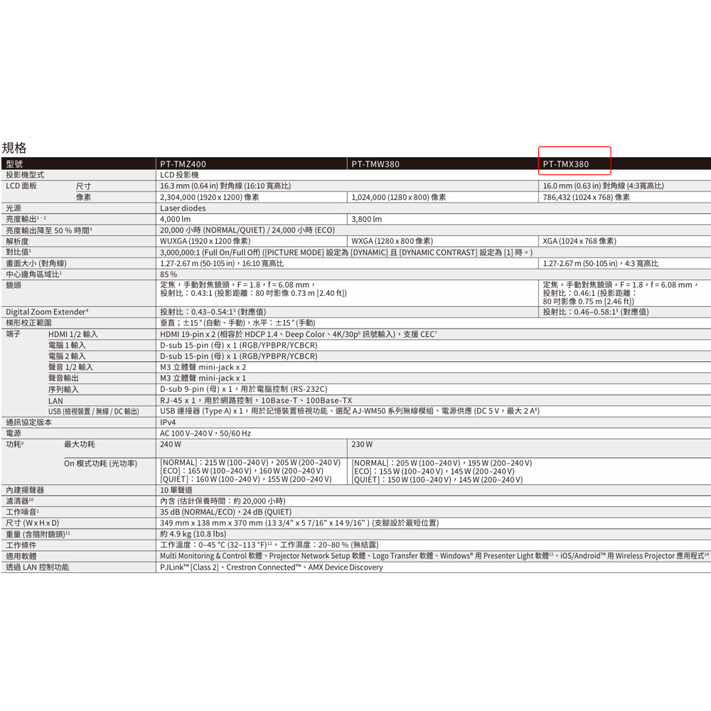 昌運監視器 Panasonic PT-TMX380T 3800流明 XGA解析度 3LCD 短焦 雷射投影機