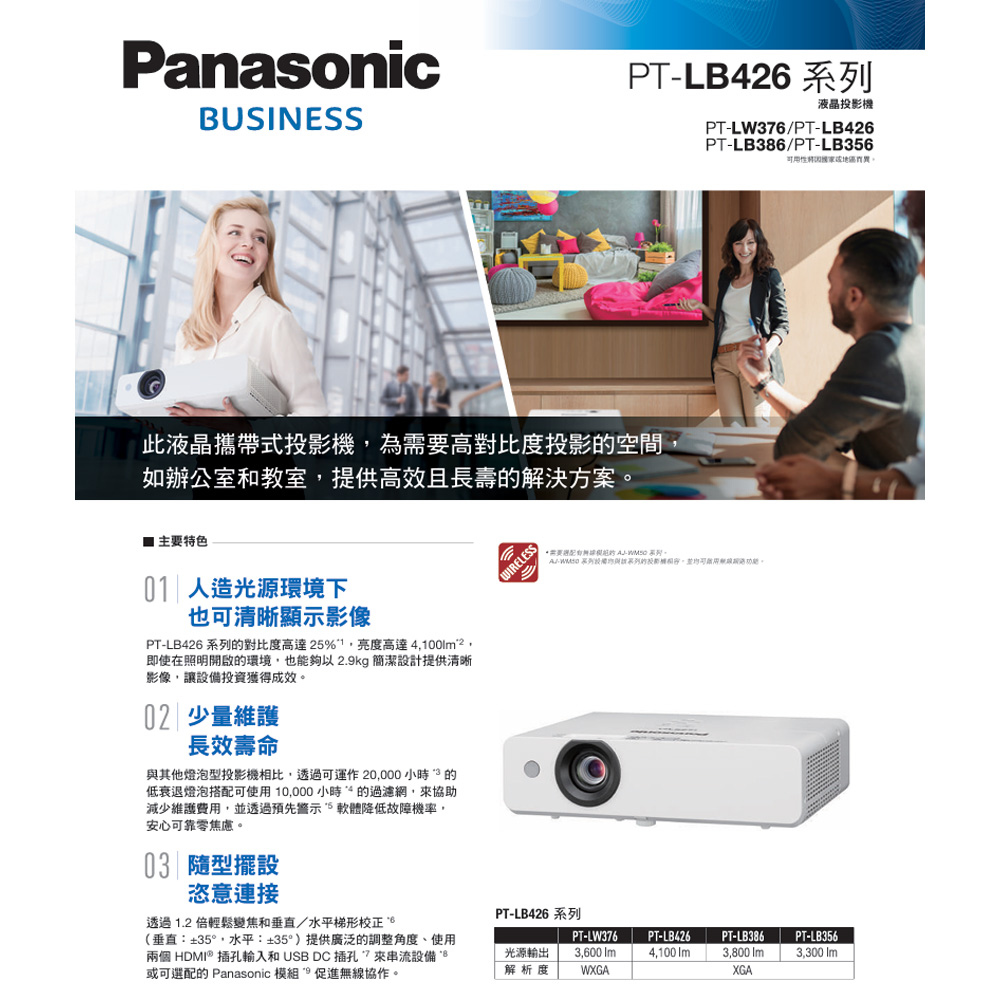 PT-LB426 系列的對比度高達 25%*1,亮度高達 4,100lm*2,即使在照明開啟的環境,也能夠以 2.9kg 簡潔設計提供清晰影像,讓設備投資獲得成效。