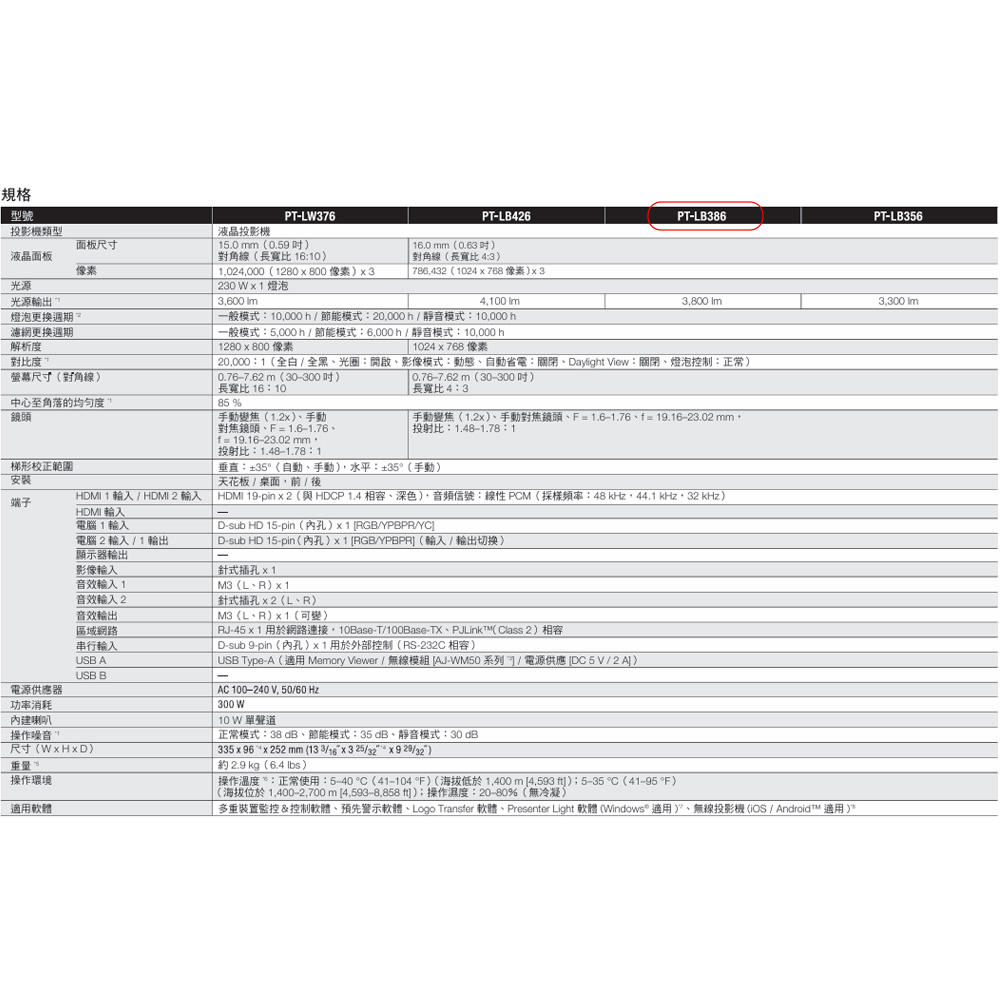 *1 PT-LB426(4,100 lm)、 PT-LB386(3,800 lm)、 PT-LW376(3,600 lm)、 PT-LB356(3,300 lm)。